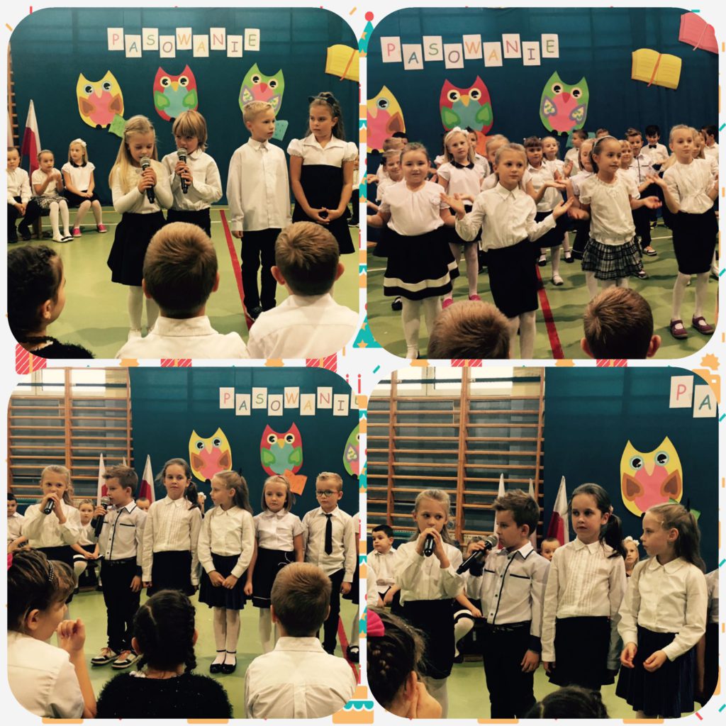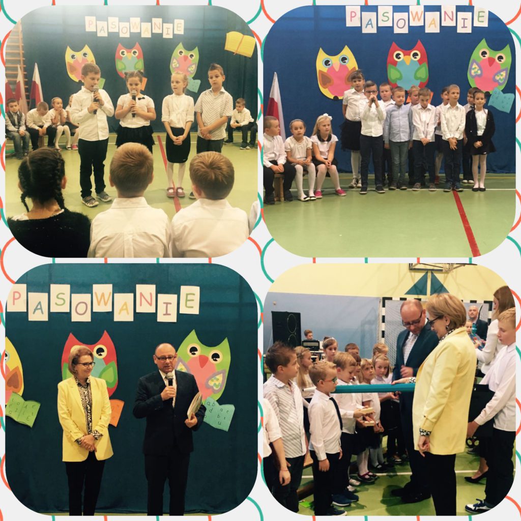 W dniu 11.10.2017r. w naszej szkole odbyło się uroczyste pasowanie na ucznia klasy pierwszej. Swoją obecnością zaszczycił nas Burmistrz Miasta , pan Dariusz Skrobol. Pierwszoklasiści recytowali wiersze, śpiewali piosenki przedstawiające ich pierwsze dni w szkole. Następnie złożyli uroczysty tekst ślubowania, w którym obiecywali być dobrymi uczniami i wspaniałymi kolegami, po czym zostali pasowani dużym ołówkiem przez panią Dyrektor, co oznacza przyjęcie do społeczności szkolnej. Każdy pierwszoklasista otrzymał pamiątkowy dyplom i róg obfitości. Po skończonej akademii nasi bohaterowie wraz z rodzicami udali się na słodki poczęstunek, zorganizowany przez swoich rodziców.