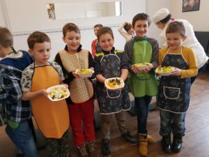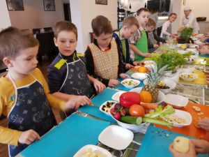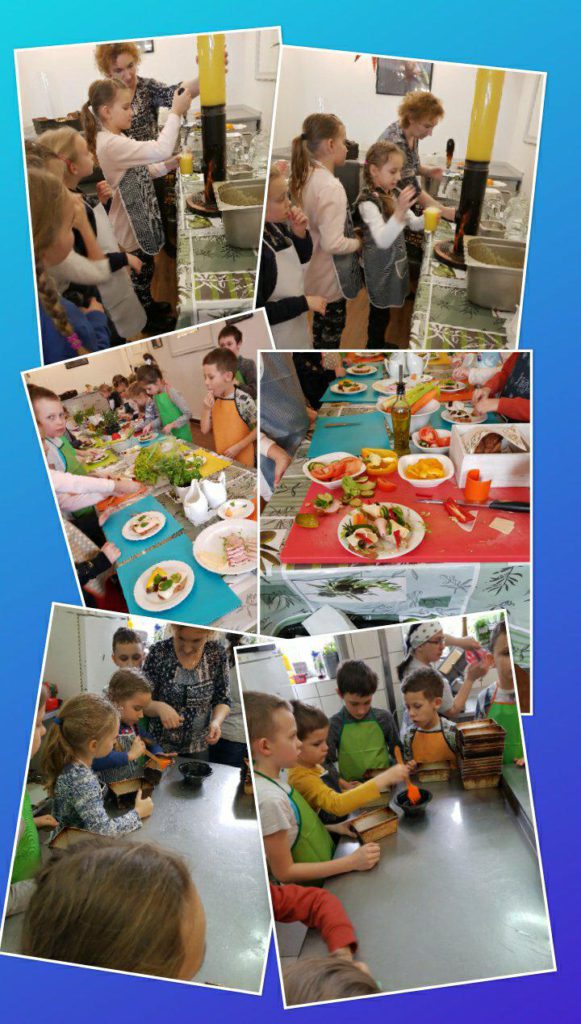 Warsztaty kulinarne rozpoczęliśmy od zwiedzania restauracji Patio Con Gusto, potem udaliśmy się na słodki poczęstunek, gdzie mogliśmy spróbować pysznych ciast, ciasteczek i wypić orzeźwiające soczki. Następnie każdy mały kucharz otrzymał niezbędnik każdego gastronoma: nożyk, deskę do krojenia i fartuszek. Zaraz potem dzieci pod okiem sympatycznej kucharki – pani Iwony przygotowywały sałatki owocowe, jarzynowe, kanapki i pyszną lemoniadę. Na samym końcu mali kucharze odwiedzili kuchnię i tam przygotowywali firmowy chlebek pełnoziarnisty. Zajęcia były bardzo emocjonujące, wszystkie wykonane przez siebie produkty uczniowie przywieźli do domu.