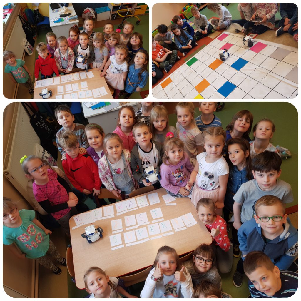 Pierwszoklasiści doskonale wiedzą na czym polega kodowanie i programowanie więc postanowili przybliżyć ten temat naszym przedszkolakom. Uczniowie z  robotami – Stasiem i Robertem (bo takie wybrali imiona dla nich) wybrali się do grupy Pszczółek. Każdy uczeń wcielił się w rolę nauczyciela i uczył przedszkolaki kierowania robotem poprzez specjalną aplikację .