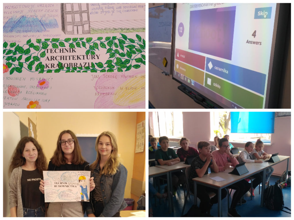 Klasy starsze miały okazję uczestniczyć w zajęciach z doradcą zawodowym, podczas których przygotowywano plakaty przedstawiające zawody z branży budowlanej, środowisko pracy, umiejętności i kompetencje potrzebne do pracy w tych zawodach oraz ścieżki kariery. Uczniowie klasy 5a i 6a przeprowadzili wywiady z budowlańcami, którzy na co dzień pracują w branży (cieśla oraz glazurnik). Efektem finalnym OTK w naszej szkole był udział uczniów klas V-VIII w I edycji quizu z wiedzy o zawodach. Przedstawiciele każdej z klas rozwiązywali multimedialny test na platformie kahoot. Wszystkie działania przyniosły zamierzone efekty w postaci poznania branży, zawodów i środowiska ludzi pracujących w tzw. „budowlance”, a młodzież klas ósmych miała okazję do refleksji, czy warto uczyć się właśnie w takich zawodach w szkole ponadpodstawowej.