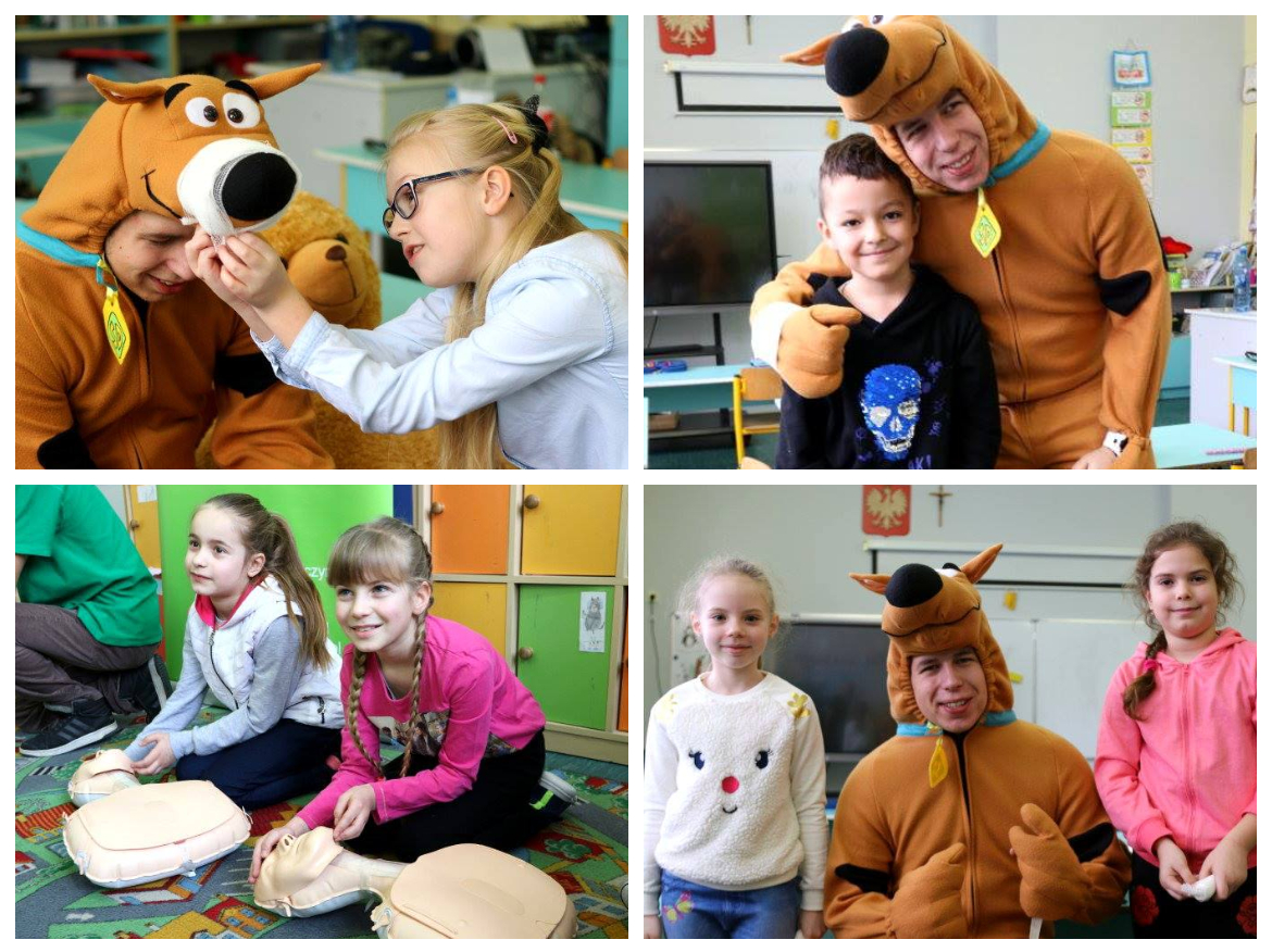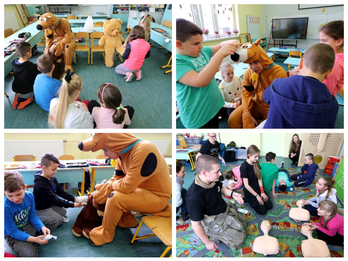 W grupach przeprowadzone zostały ćwiczenia: RKO na manekinach, pozycja bezpieczna oraz bandażowanie misia, Scoobiego i kolegi lub koleżanki.