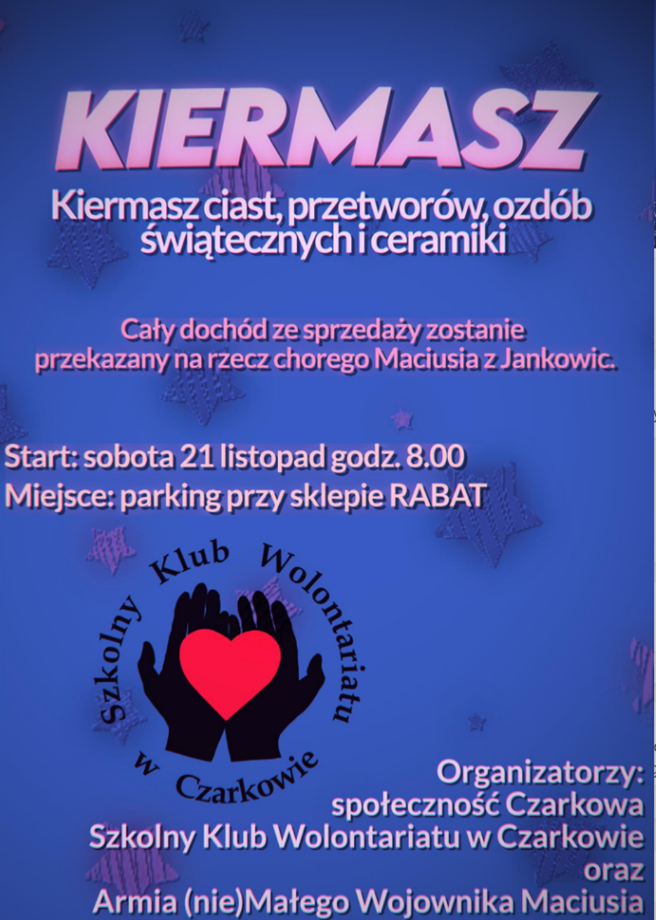 Społeczność Czarkowa wraz ze Szkolnym Klubem Wolontariatu i Armią (nie)Małego Wojownika Maciusia zapraszają na kiermasz ciast, przetworów, ozdób świątecznych i ceramiki, który odbędzie się w sobotę 21 listopada od godziny 8.00 na parkingu przy sklepie Rabat w Czarkowie.