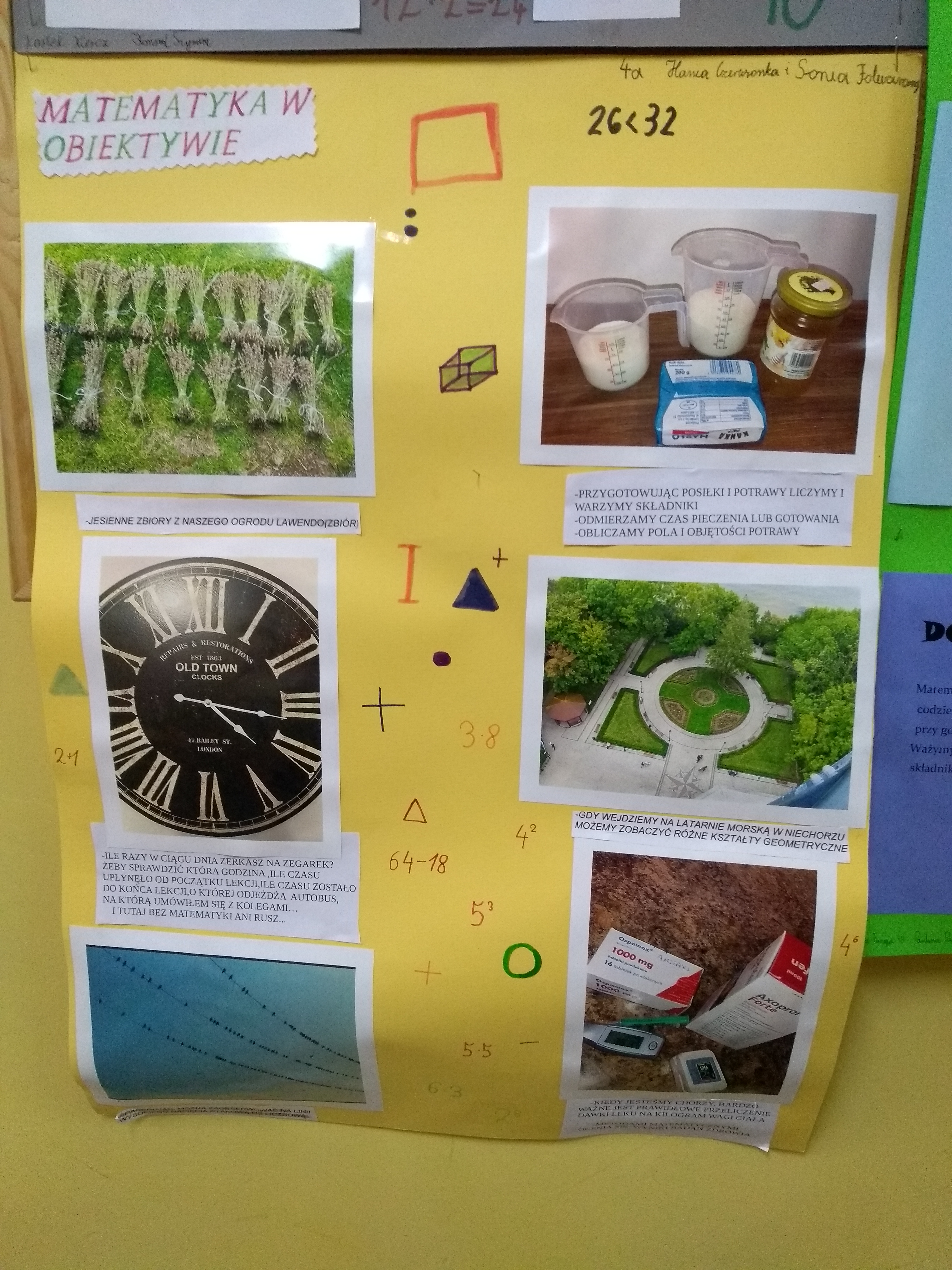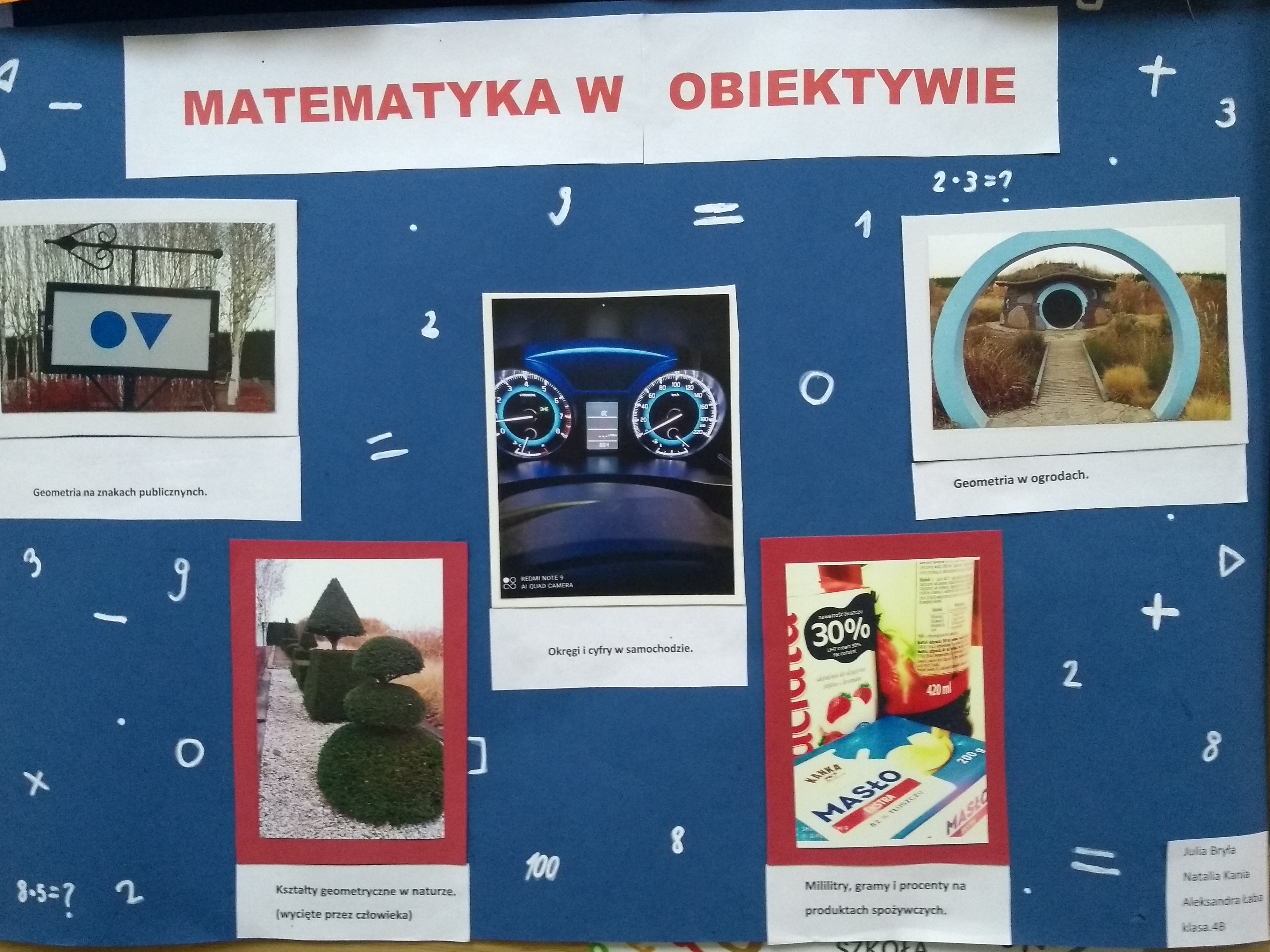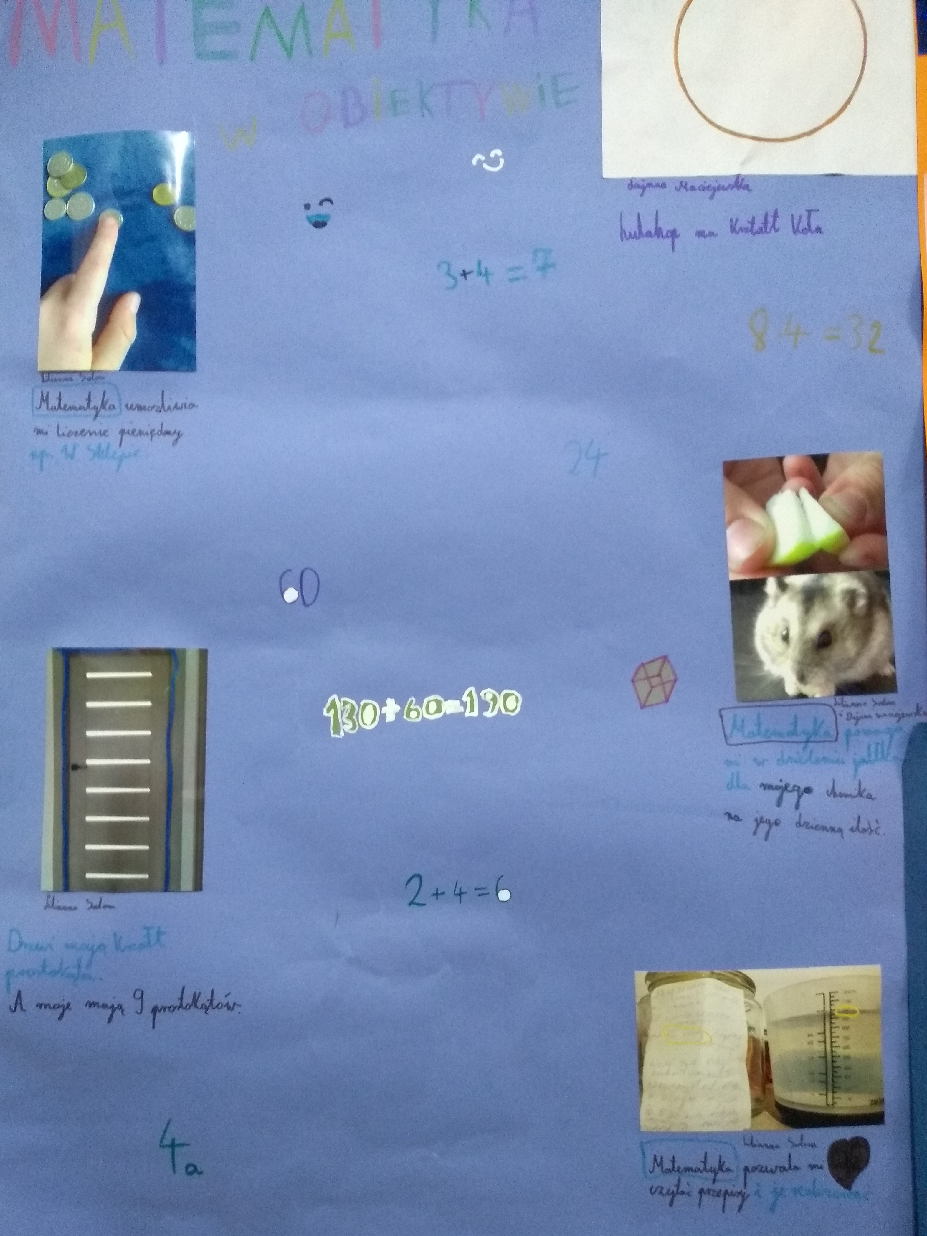 Uczniowie klas 4-6 wzięli udział w projekcie metamatematycznym „Matematyka w obiektywie”.Celem projektu było:• poszukiwanie matematyki w codzienności• rozwijanie spostrzegawczości, pomysłowości, kreatywności• kształtowanie wyobraźni przestrzennej• rozwijanie umiejętności stosowania pojęć matematycznych w życiucodziennym• rozwijanie umiejętności pracy w zespole.Praca nad projektami  odbywała się w zespołach 2-3 osobowych. Zadaniemuczniów było wykonanie plakatu z 5 zdjęciami związanymi z  zastosowaniemmatematyki w życiu codziennym. Uczniowie wykazali się pomysłowością orazkreatywnością. Spośród projektów nauczyciele matematyki wyróżnili 16prac. Nagrody i dyplomy zostały wręczone podczas apelu.Dziękujemy za zaangażowanie.Nauczyciele matematykiR. Dybowicz, M.Pławecka