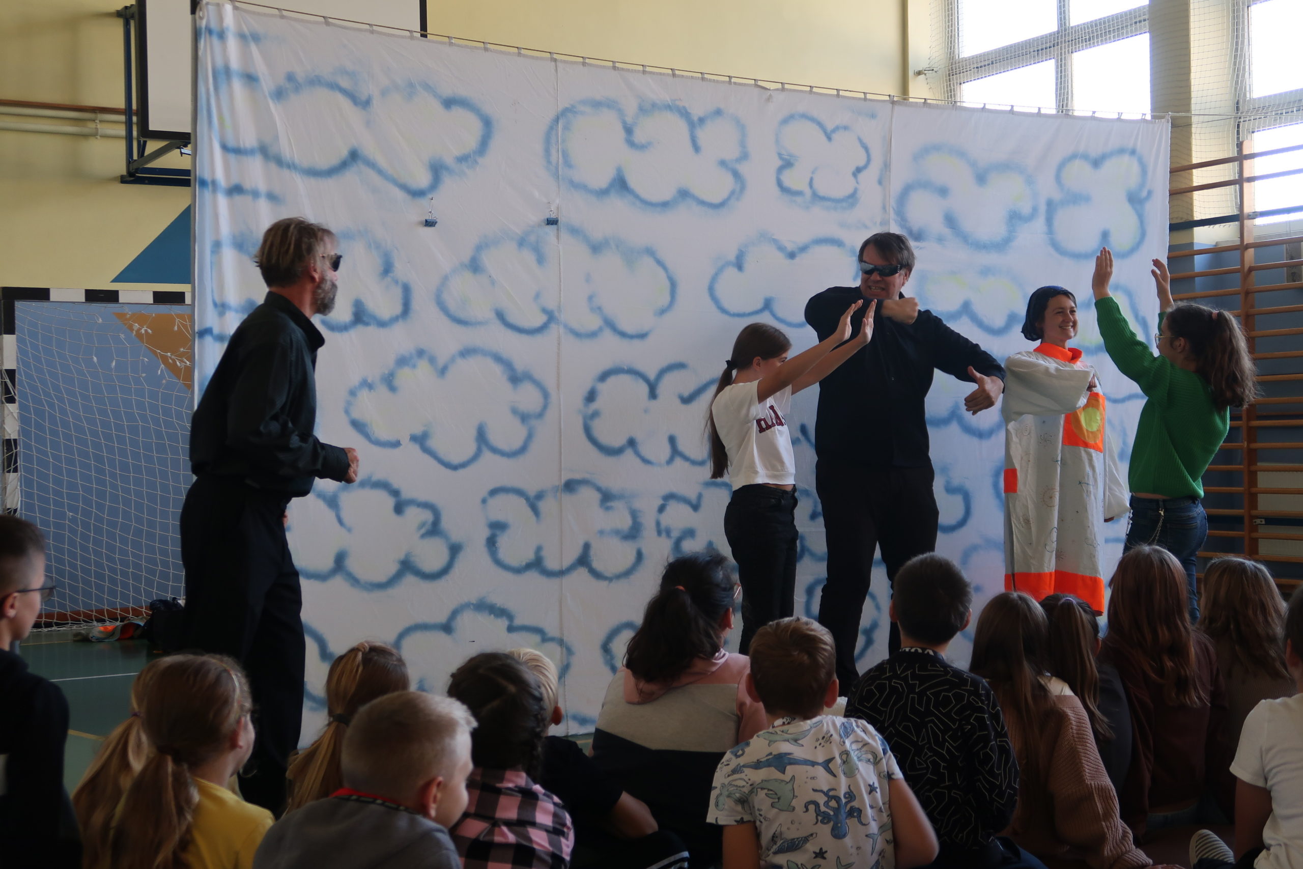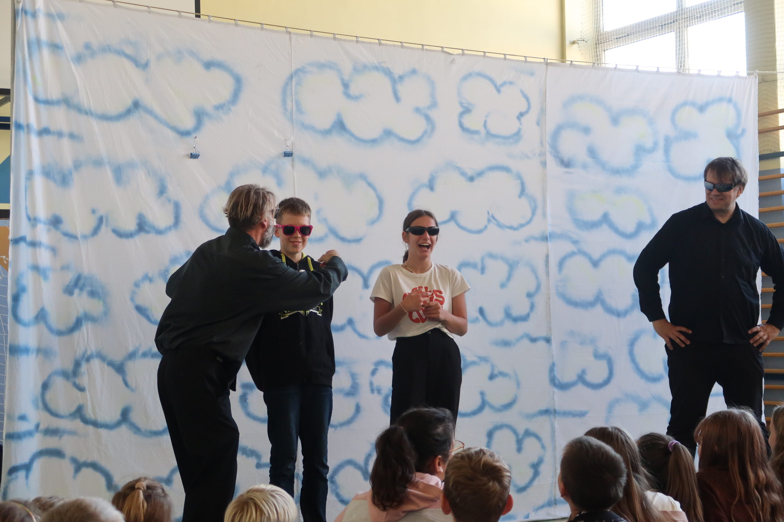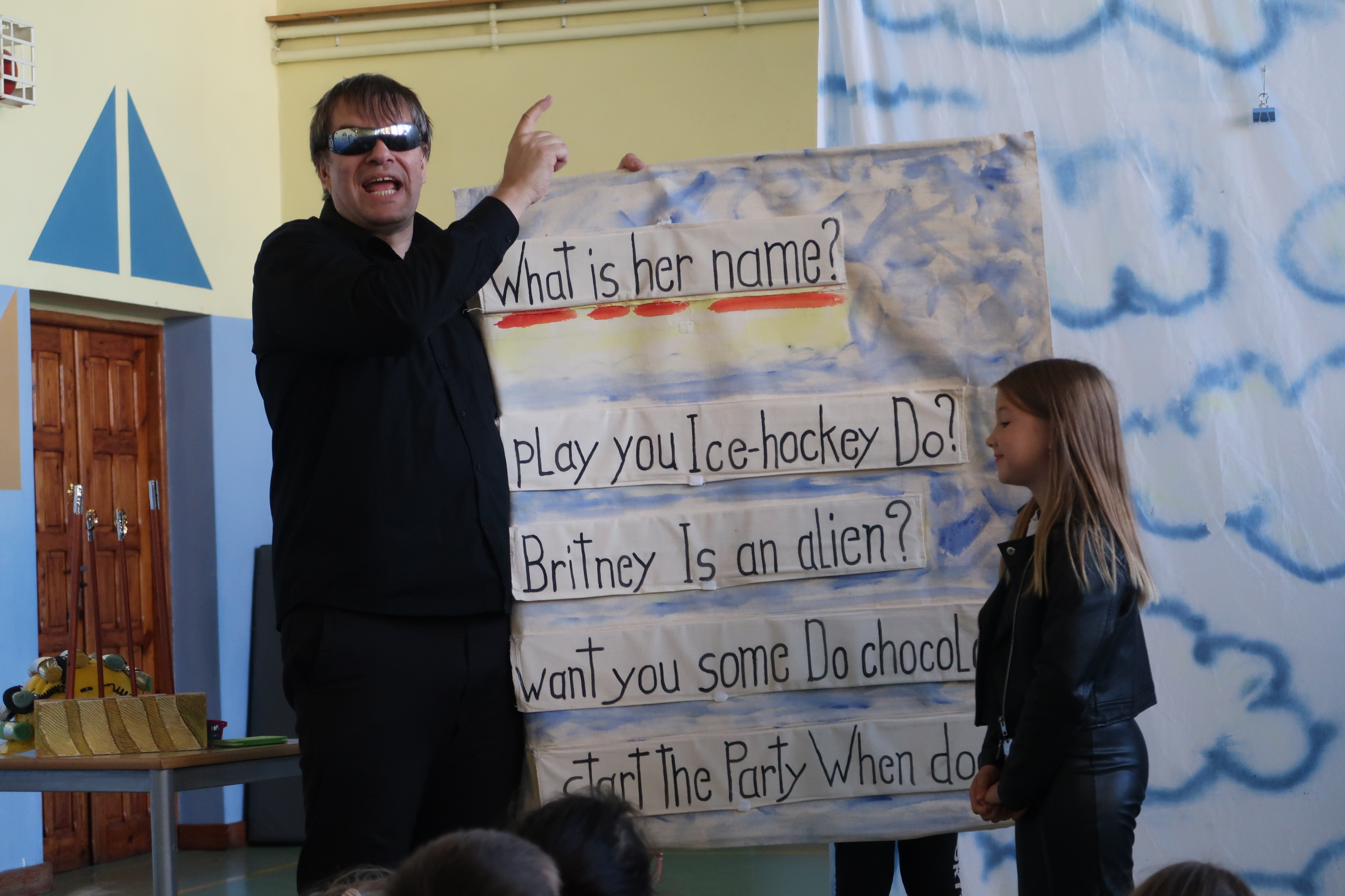 18 października wyszło na jaw, że wśród uczniów naszej szkoły ukrywała się dwójka zagubionych dzieci rodziny kosmitów – Blip i Blop. Za zdemaskowaniem nieletnich kosmitów stali agenci, którzy przez blisko godzinę poszukiwali przybysza z obcej planety w celu zlikwidowania go.Ku zaskoczeniu zgromadzonych na sali gimnastycznej osób, jeden z agentów okazał się ich ojcem, a poszukiwany „obcy” matką. Historia ma dobre zakończenie – sympatyczna rodzina „nie z tej ziemi” bezpiecznie odleciała do siebie, a agent wrócił do bazy bez więźniów.Wydarzenia na sali gimnastycznej wiążą się z występem grupy teatralnej „The Bear Educational Theatre”. Jej dyrektor – David Fisher – wraz z dwójką aktorów odwiedził naszą szkołę z przedstawieniem, które pozwoliło utrwalić budowę pytań w języku angielskim. Niezależnie od wartości edukacyjnej, „the Alien Grammar Show” dostarczyło nam sporo rozrywki. Aktorzy zaprosili do gry kilkoro uczniów naszej szkoły oraz często angażowali widownię do wypowiadania się w języku angielskim. Widownia dobrze się bawiła, o czym świadczą między innymi kolejki po autograf na koniec spotkania.