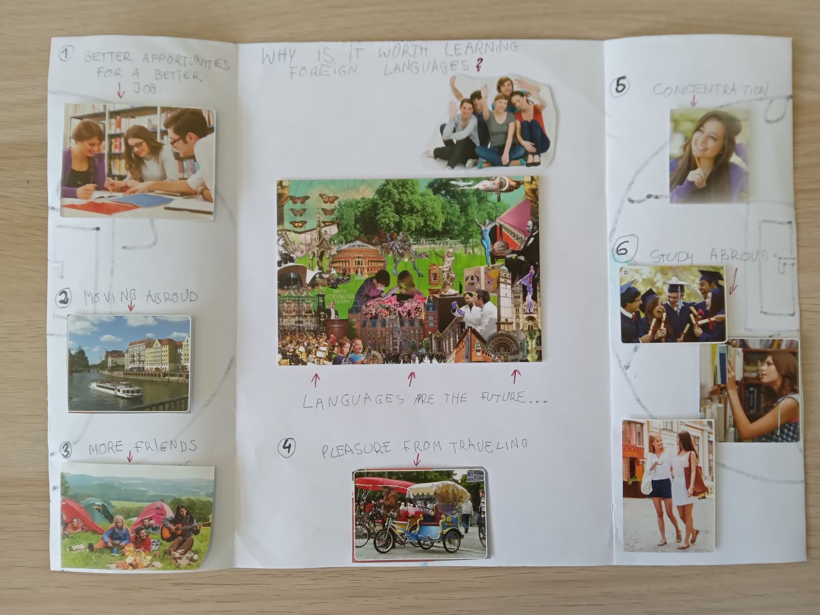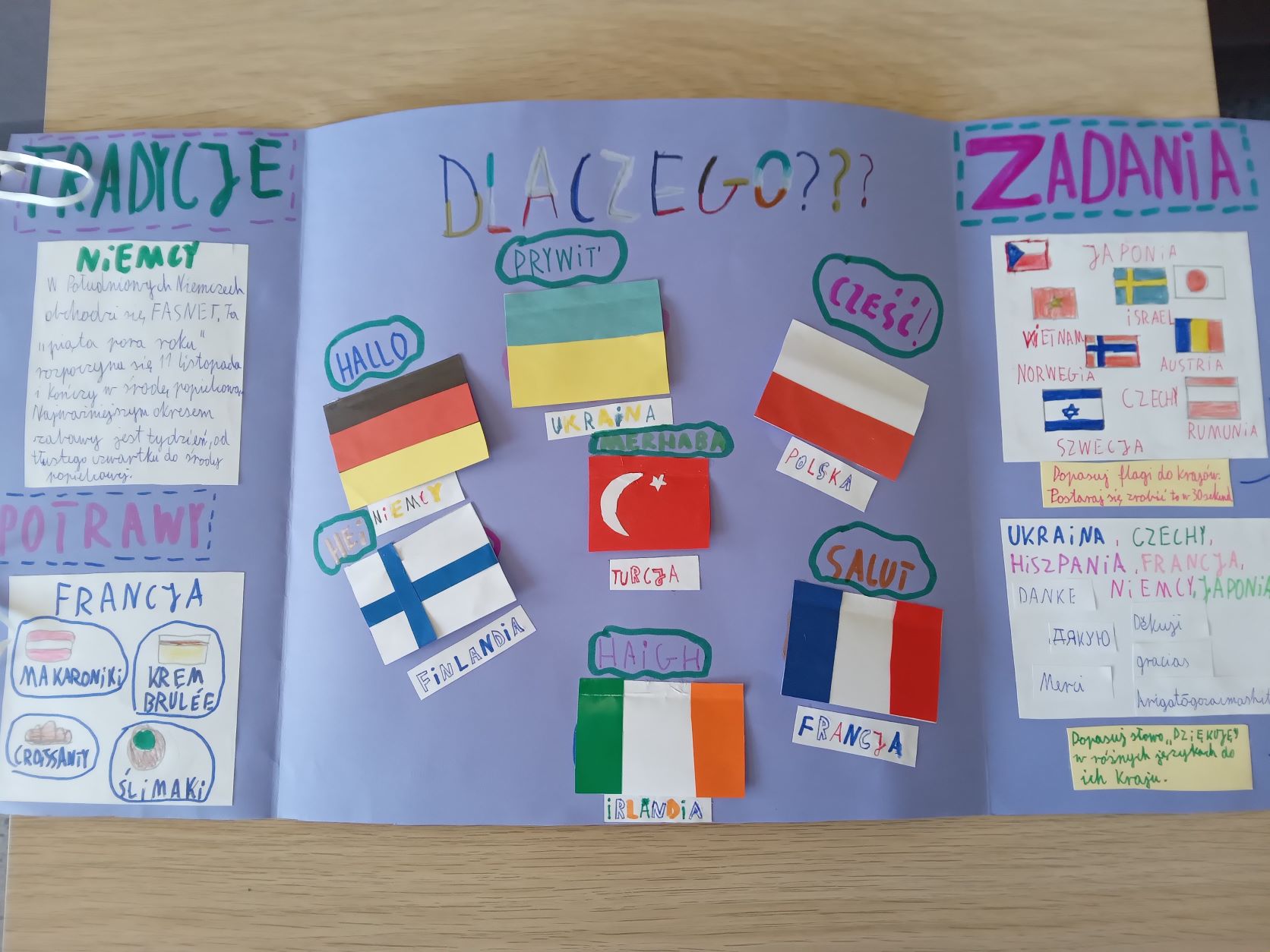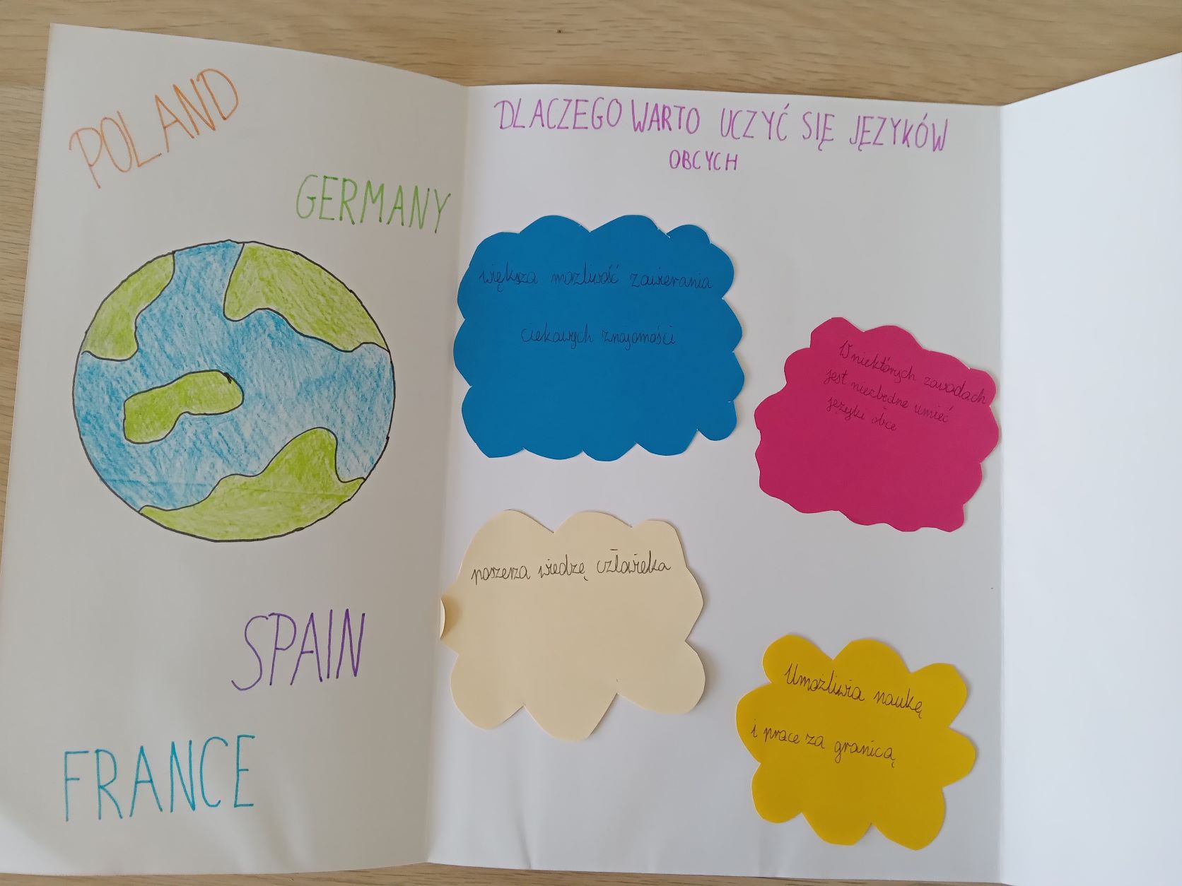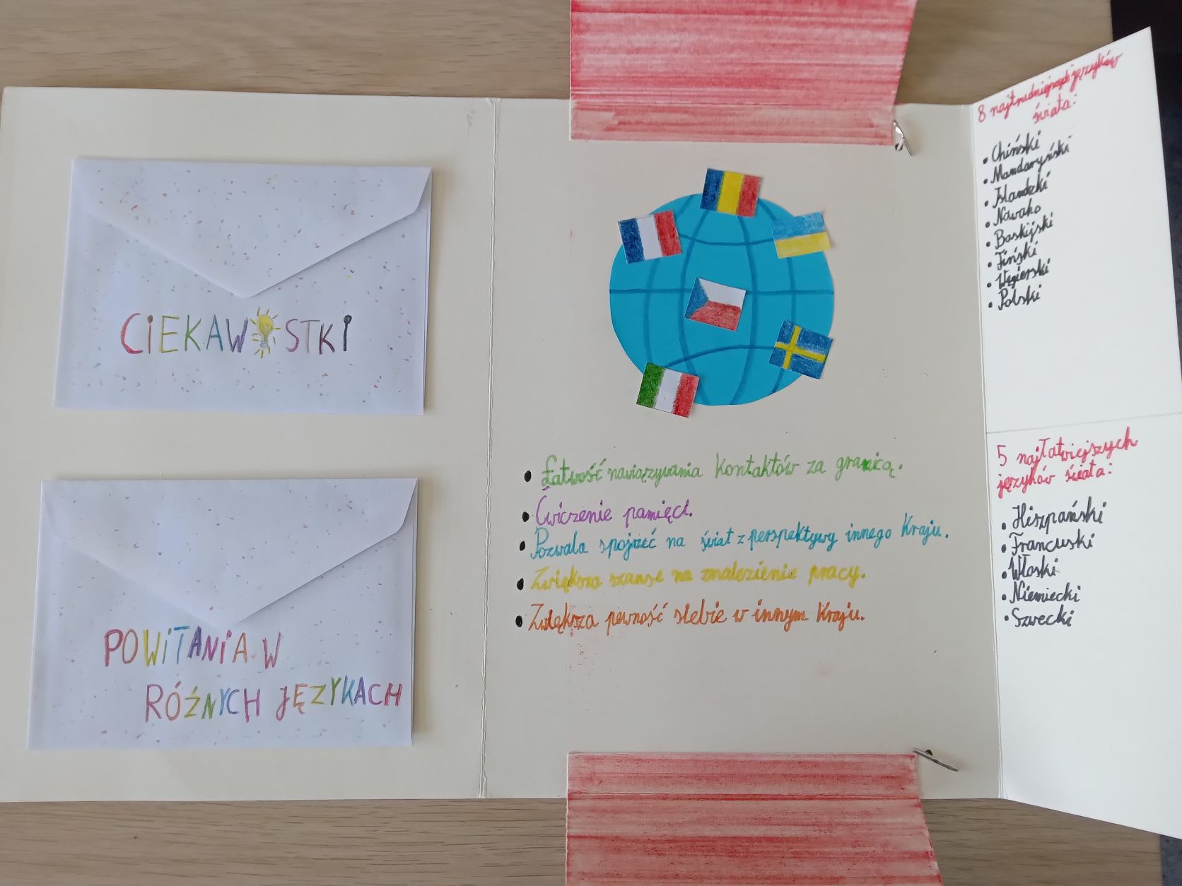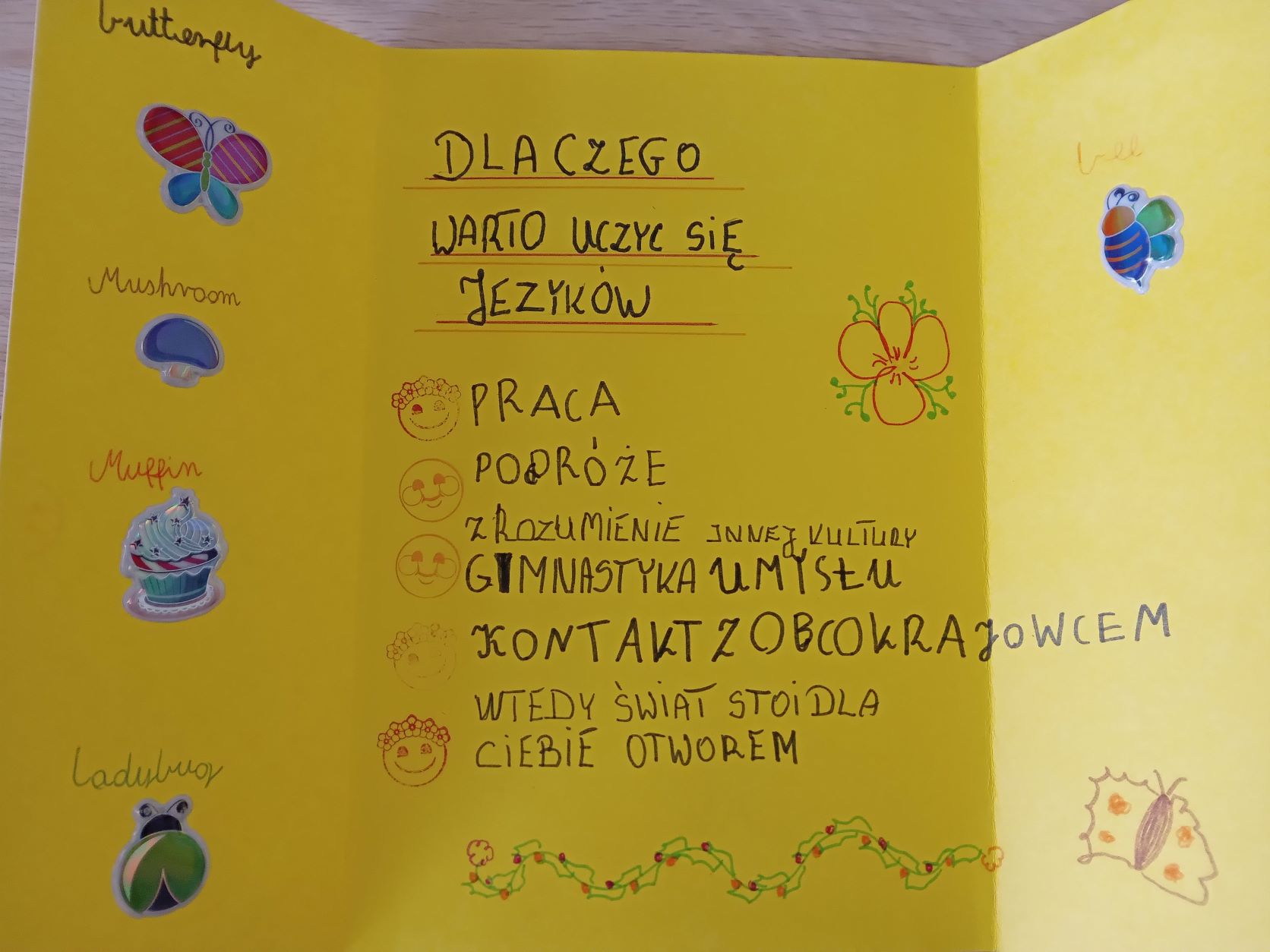 W związku z tym obchody Europejskiego Dnia Języków Obcych wiążą się z apelem o podejmowanie nauki większej liczby języków i to niezależnie od wieku uczących się oraz formy kształcenia – szkolnej czy pozaszkolnej. W tym roku 26 września nasza szkoła po raz kolejny przyłączyła się do świętowania. W poprzedzającym ten dzień tygodniu klasy 4-8 przygotowały wspólnie na lekcji angielskiego plakat przedstawiający wybrane aspekty wylosowanego kraju europejskiego. Oprócz mapy, flagi i nazwy kraju w jego urzędowym języku, każda klasa przygotowała listę słówek opisujących wybrane produkty żywnościowe i potrawy. Dodatkowo na plakatach znalazły się przydatne wyrażenia (np. „dzień dobry”, „dziękuję”, itp.) oraz liczebniki 1-10. Niektóre klasy miały wyjątkowo trudne zadanie, gdyż wylosowane kraje korzystają z nieznanych uczniom alfabetów (np. Grecja lub Ukraina). 26 września plakaty zostały udostępnione na korytarzu, lekcje angielskiego we wszystkich klasach zostały wzbogacone o prezentacje dotyczące języków w Europie, a na długiej przerwie odbył się interaktywny quiz językowy. Dokonano również wyboru wyróżniających się plakatów oraz lapbooków wyjaśniających „Dlaczego warto uczyć się języków obcych”. Po długiej naradzie postanowiono wyróżnić plakaty klasy 5b, 4a i 4b, a wśród lapbooków nagrodzić Jagodę Flis, Emilię Ziółkowską i Natalię Swadźbę. Gratulujemy zwycięzcom, ale również pozostałym uczestnikom obu konkursów!