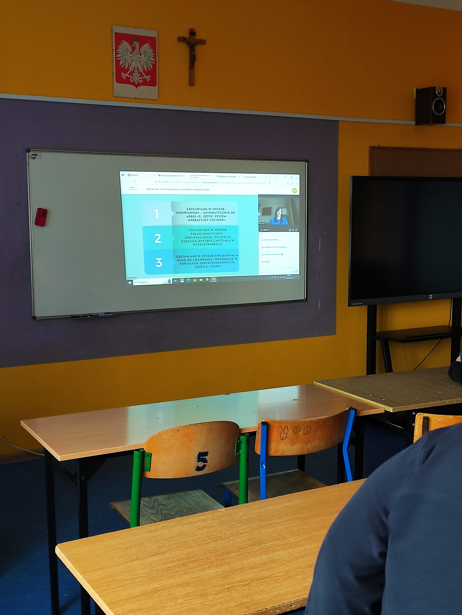 Uczniowie klasy 8 a uczestniczyli w lekcji online pt: Cyfrowy ślad – ile można wyczytać o człowieku z otwartych źródeł. Prowadząca opowiedziała, ile można wyczytać z biernie udostępnianych informacji dotyczących adresu IP, geolokalizacji czy metadanych zamieszczanych fotografii. Przedstawione zostały także przykładowe sposoby na ograniczenie liczby udostępnianych informacji.