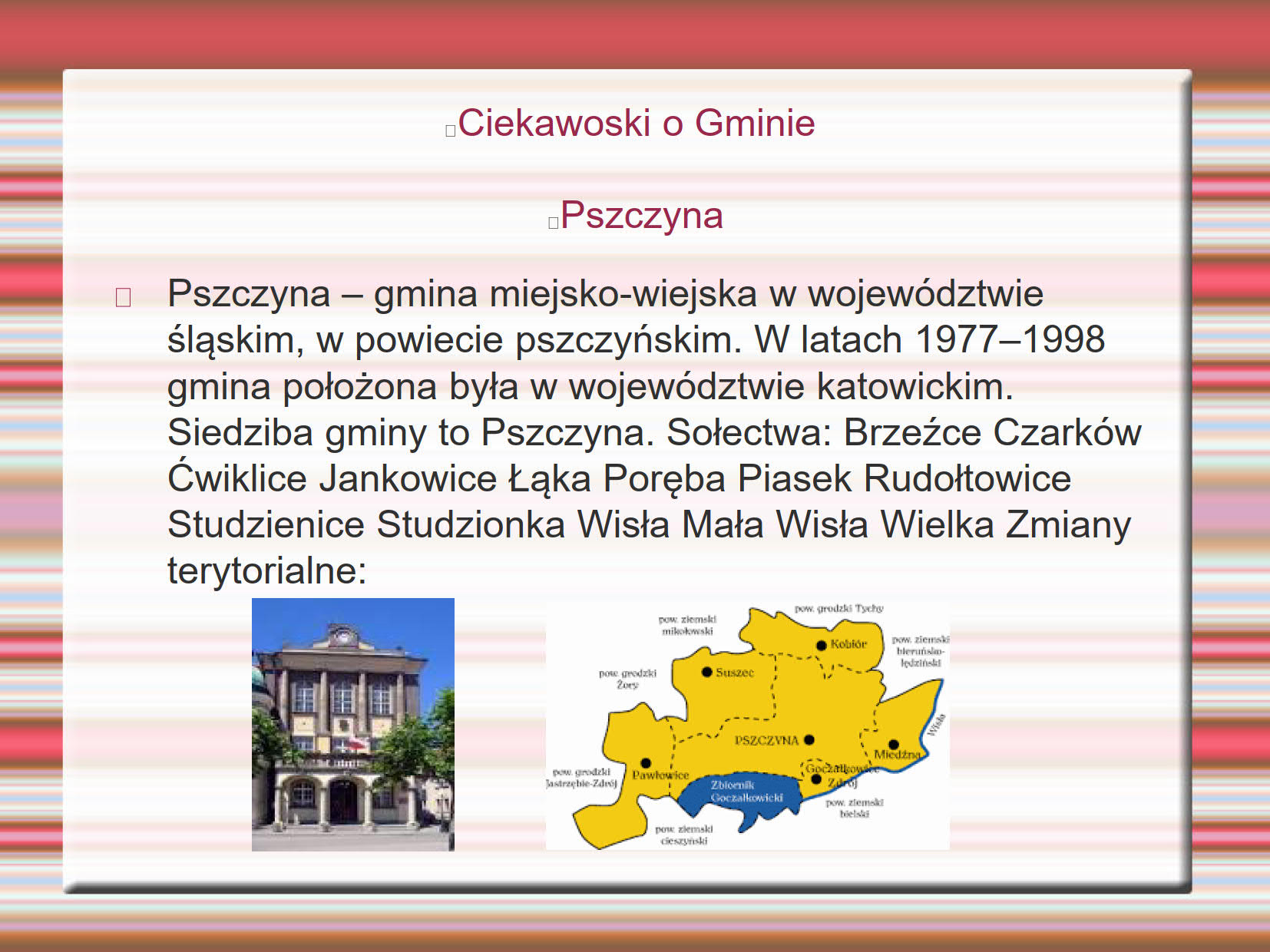 Uczniowie i uczennice klas ósmych na lekcjach wiedzy o społeczeństwie pracowali nad klasowymi projektami edukacyjnymi. Tematyka związana była z samorządem terytorialnym. Klasa 8a zebrała i opracowała informacje i ciekawostki o sołectwie Czarków, a klasa 8b przygotowała projekt o gminie Pszczyna. Efekty ich prac przedstawiamy w poniższych prezentacjach: