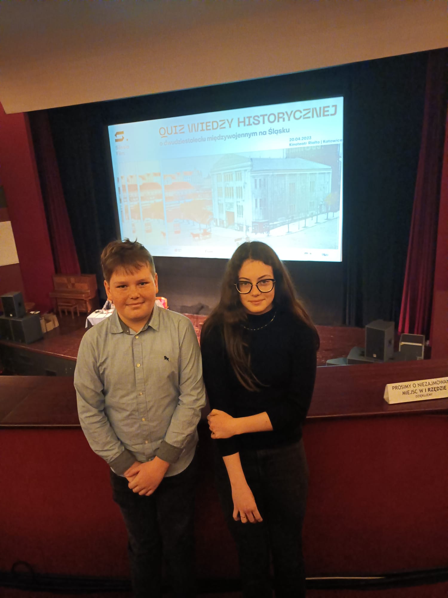Kolejny sukces naszych uczniów! Tym razem Julia Woźnikowska i Wojciech Kupiec z kl.8a zajęli III miejsce w Wojewódzkim Quizie Historycznym z wiedzy o dwudziestoleciu międzywojennym na Śląsku. Konkurs odbył się w historycznym miejscu – Kinoteatrze Rialto w Katowicach i historycznym dniu – w 150.rocznicę urodzin Wojciecha Korfantego. Serdecznie gratulujemy!