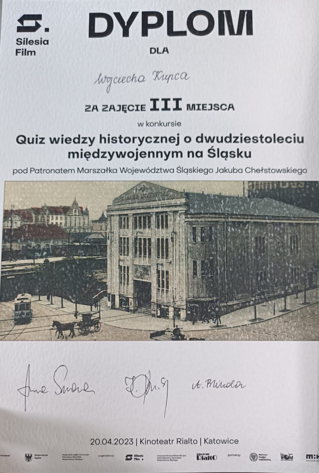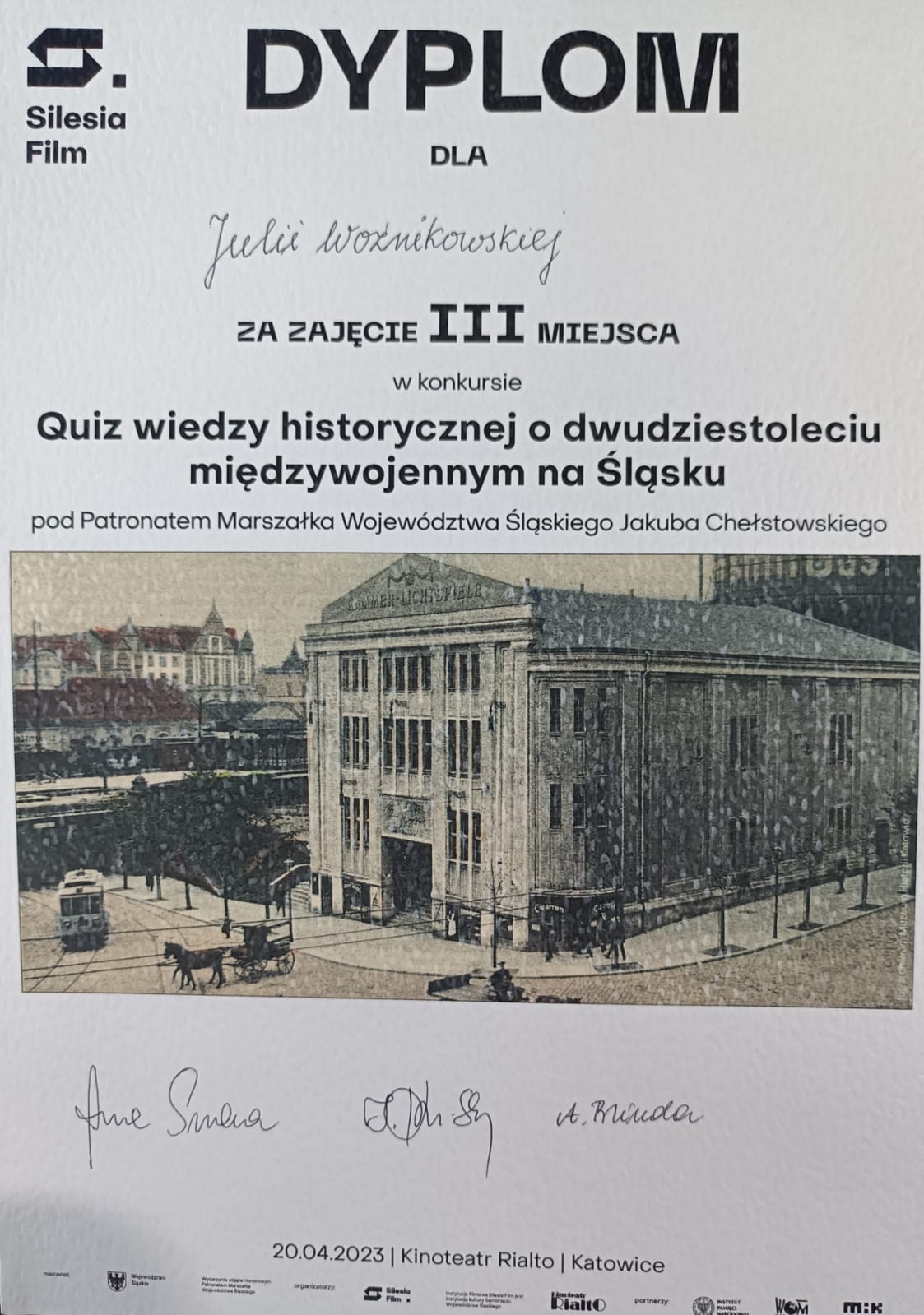 Kolejny sukces naszych uczniów! Tym razem Julia Woźnikowska i Wojciech Kupiec z kl.8a zajęli III miejsce w Wojewódzkim Quizie Historycznym z wiedzy o dwudziestoleciu międzywojennym na Śląsku. Konkurs odbył się w historycznym miejscu – Kinoteatrze Rialto w Katowicach i historycznym dniu – w 150.rocznicę urodzin Wojciecha Korfantego. Serdecznie gratulujemy!