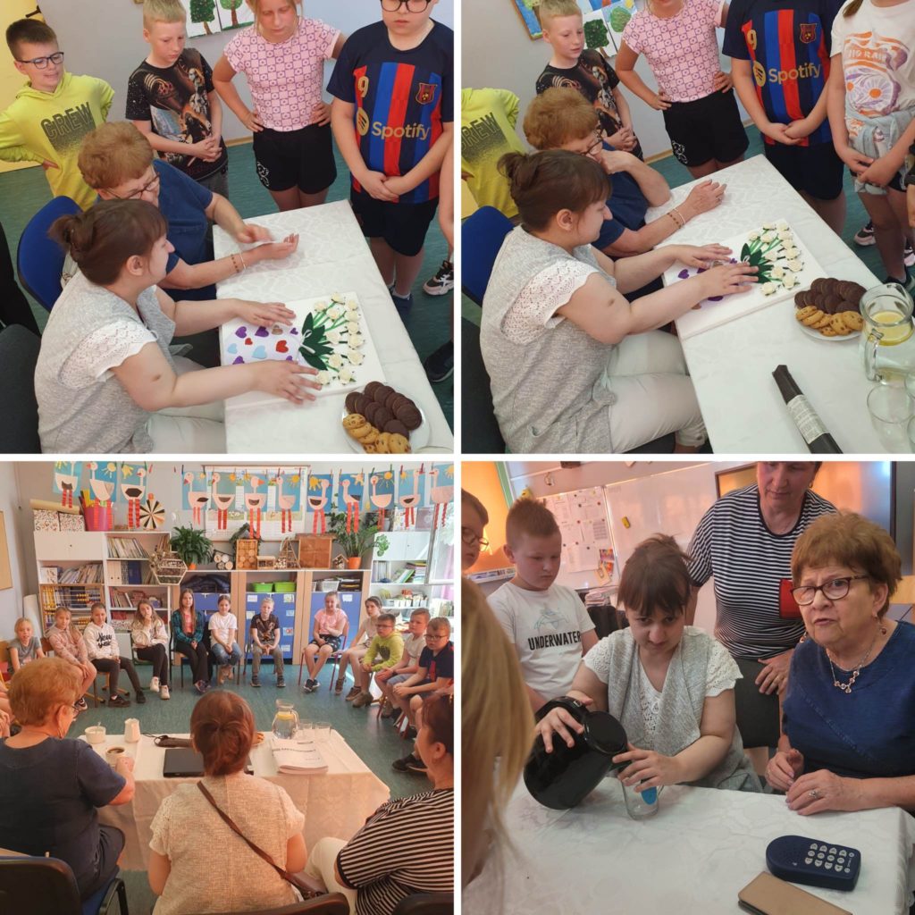 31 maja 2023r klasę IIIb odwiedziła pani Agnieszka Kukla. Towarzyszyły jej panie Helena Mazur – prezes Zarządu Koła Polskiego Związku Niewidomych w Pszczynie oraz pani Barbara Kukla, mama pani Agnieszki.Pani Agnieszka opowiedziała dzieciom o tym, jak osoby niewidome funkcjonują na co dzień oraz w jaki sposób technika pomaga im w codziennym życiu.Zaprezentowany został czujnik, który umieszcza się na brzegu naczynia, przestrzegający przed przelaniem, odtwarzacz audiobooków Czytak, biała laska oraz brajlowski magazyn polskich niewidomych i słabowidzących – „Sześciopunkt”.Dodatkowo, pani Agnieszka zaprezentowała swój telefon oraz sposób w jaki z niego korzysta, a także laptop, ze specjalnie dopasowanym systemem, odczytującym komunikaty.Wszystkie panie opowiedziały również o tym, jak zachowywać się w obecności niewidomych i w jaki sposób można im pomóc. Z chęcią odpowiedziały na wszystkie, pytania naszych zaciekawionych uczniów. Na koniec pani Agnieszka wyrecytowała dzieciom wiersz pt. „Ptasie radio”.W podziękowaniu za spotkanie otrzymała wykonany własnoręcznie przez uczniów obraz oraz mnóstwo uścisków.Spotkanie odbyło się w ramach projektu pt. „Każdy inny – wszyscy równi”. Poprzedzone było lekcją i warsztatami dotyczącymi osób niewidomych i słabowidzących.Zapraszamy do galerii zdjęć 🙂