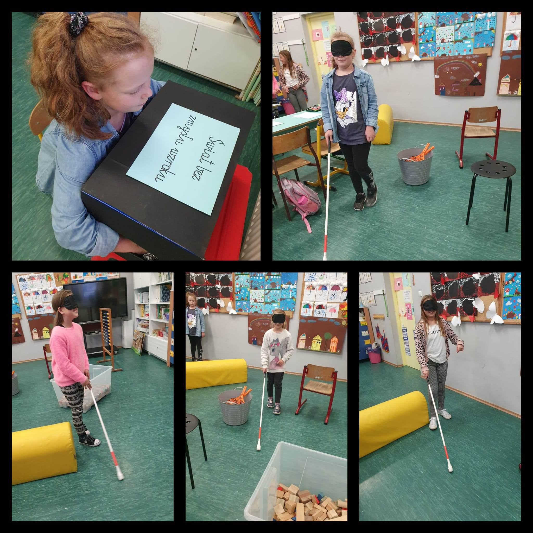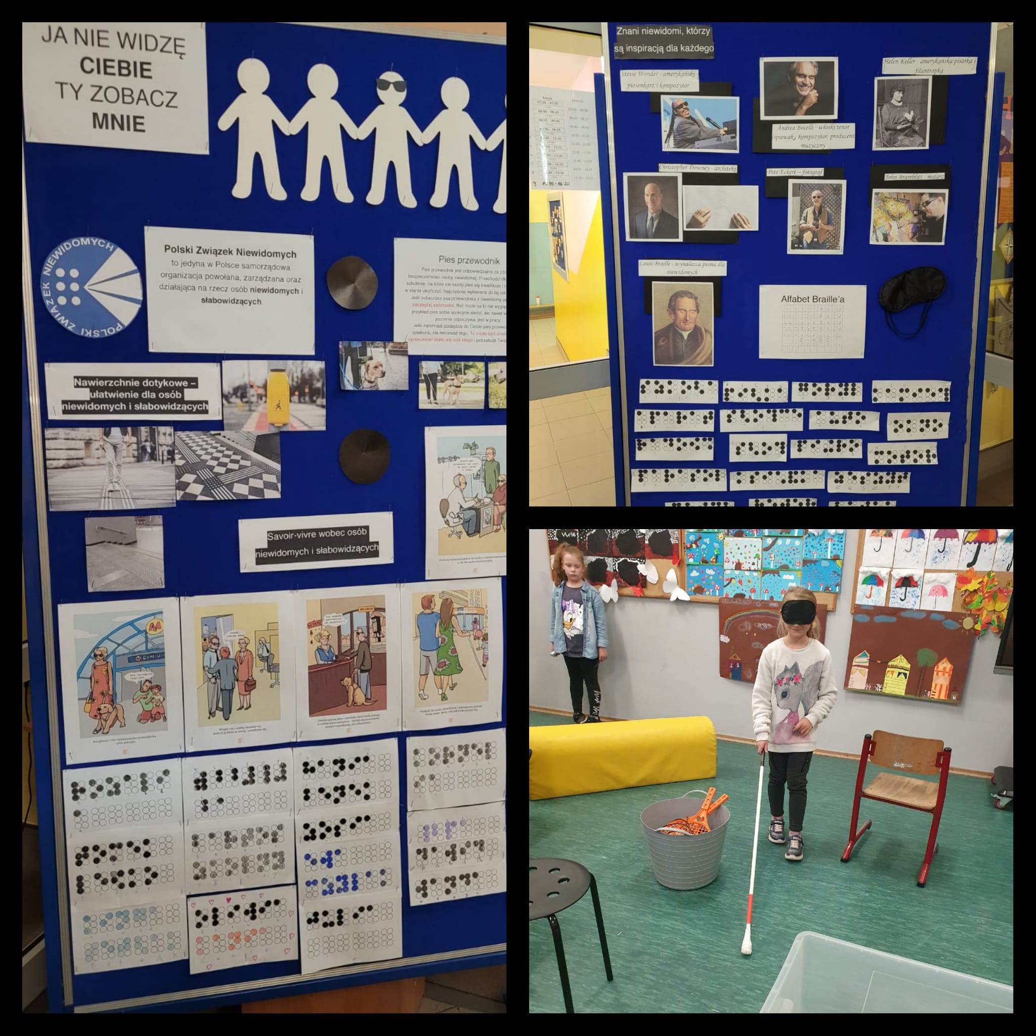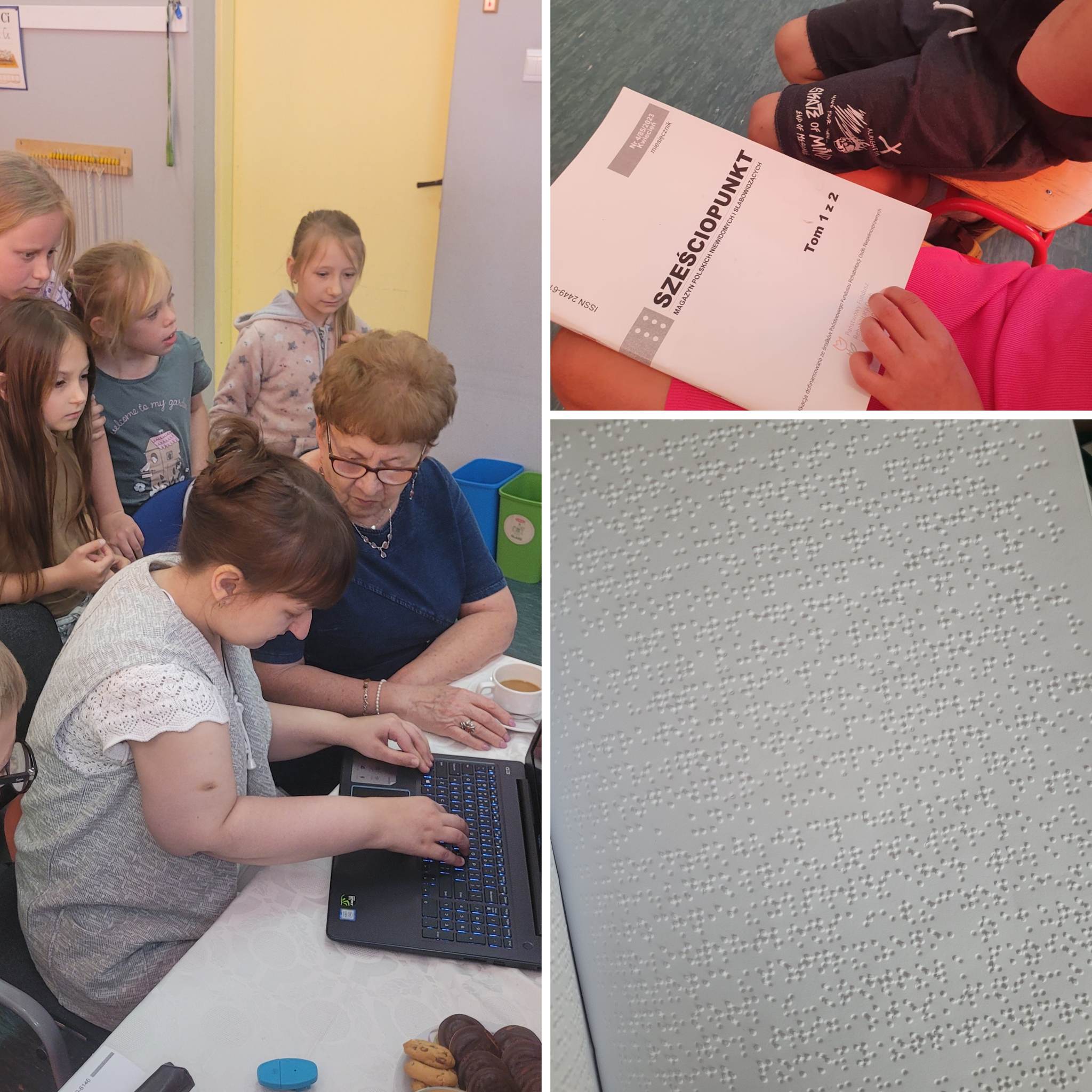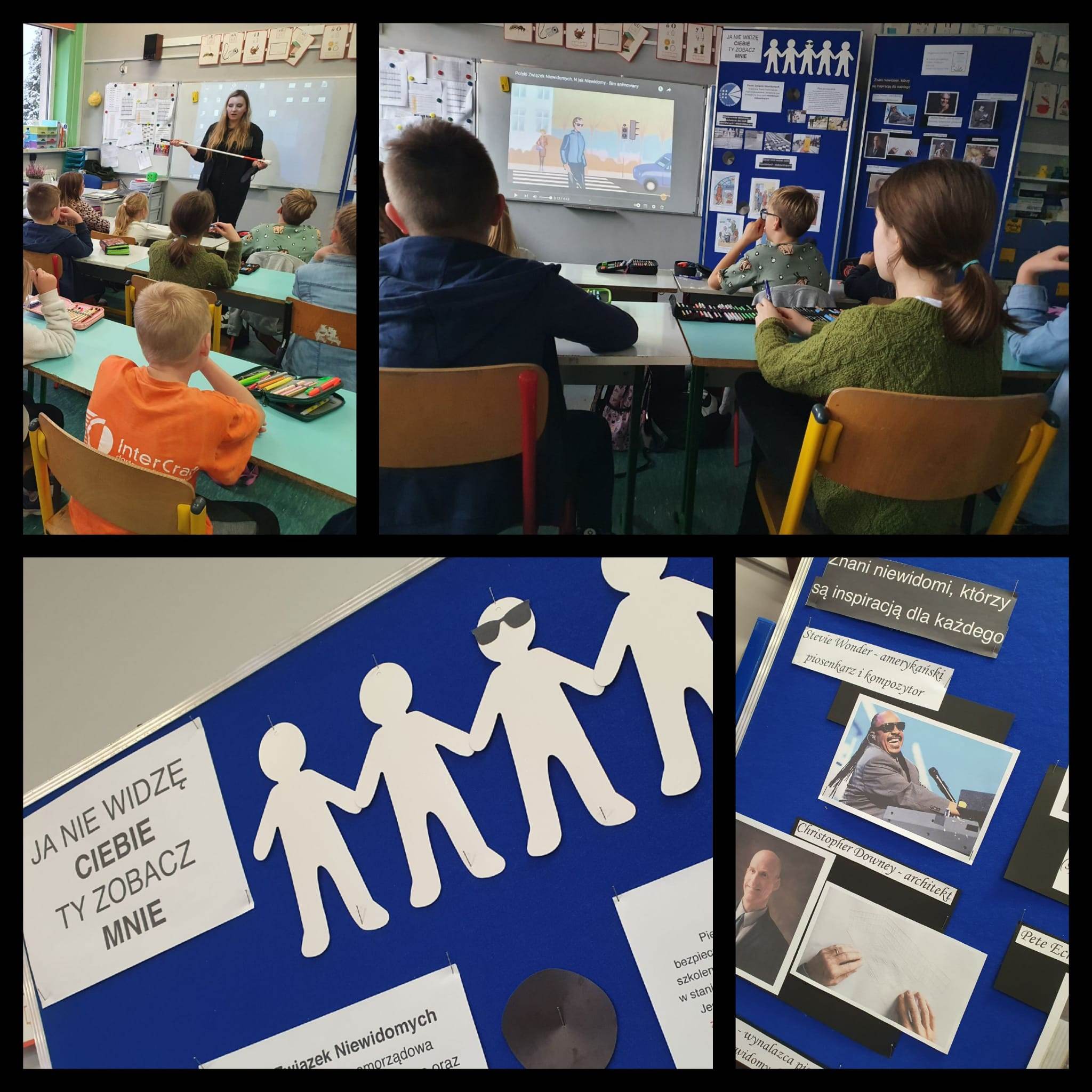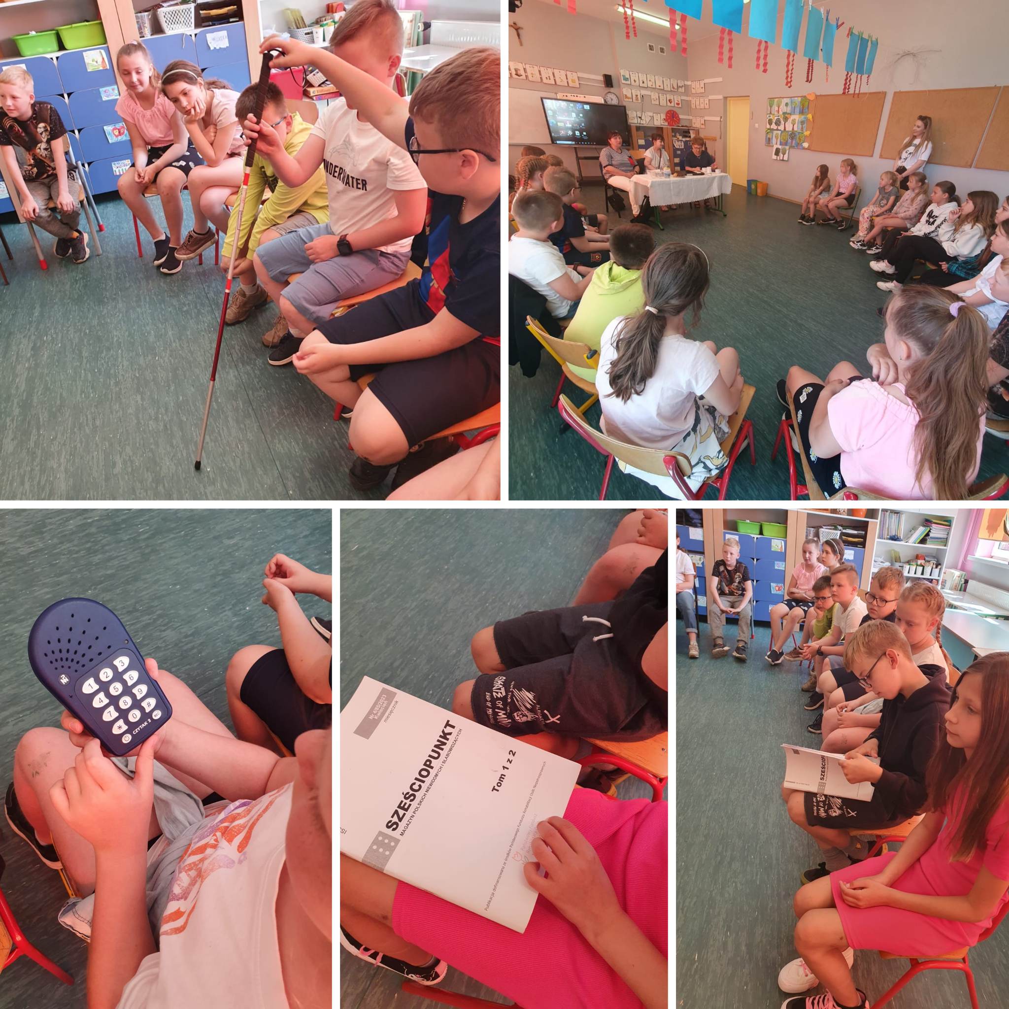 31 maja 2023r klasę IIIb odwiedziła pani Agnieszka Kukla. Towarzyszyły jej panie Helena Mazur – prezes Zarządu Koła Polskiego Związku Niewidomych w Pszczynie oraz pani Barbara Kukla, mama pani Agnieszki.Pani Agnieszka opowiedziała dzieciom o tym, jak osoby niewidome funkcjonują na co dzień oraz w jaki sposób technika pomaga im w codziennym życiu.Zaprezentowany został czujnik, który umieszcza się na brzegu naczynia, przestrzegający przed przelaniem, odtwarzacz audiobooków Czytak, biała laska oraz brajlowski magazyn polskich niewidomych i słabowidzących – „Sześciopunkt”.Dodatkowo, pani Agnieszka zaprezentowała swój telefon oraz sposób w jaki z niego korzysta, a także laptop, ze specjalnie dopasowanym systemem, odczytującym komunikaty.Wszystkie panie opowiedziały również o tym, jak zachowywać się w obecności niewidomych i w jaki sposób można im pomóc. Z chęcią odpowiedziały na wszystkie, pytania naszych zaciekawionych uczniów. Na koniec pani Agnieszka wyrecytowała dzieciom wiersz pt. „Ptasie radio”.W podziękowaniu za spotkanie otrzymała wykonany własnoręcznie przez uczniów obraz oraz mnóstwo uścisków.Spotkanie odbyło się w ramach projektu pt. „Każdy inny – wszyscy równi”. Poprzedzone było lekcją i warsztatami dotyczącymi osób niewidomych i słabowidzących.Zapraszamy do galerii zdjęć 🙂