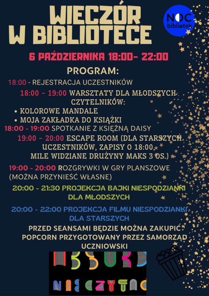 W ramach ogólnopolskiej akcji IX Nocy Bibliotek (NOC BIBLIOTEK) mamy przyjemność zaprosić Was na „Wieczór w Bibliotece Szkolnej”,który odbędzie się 6 października (piątek) w godzinach od 18:00 do 22:00.