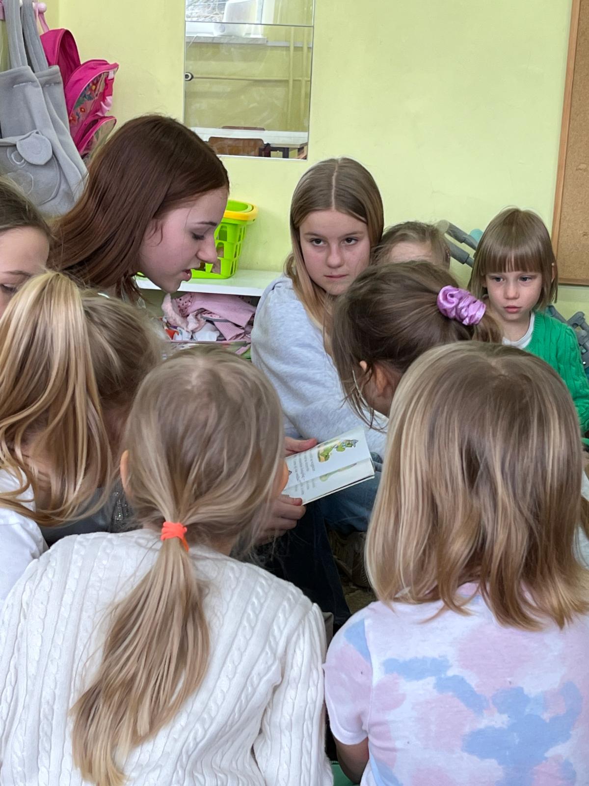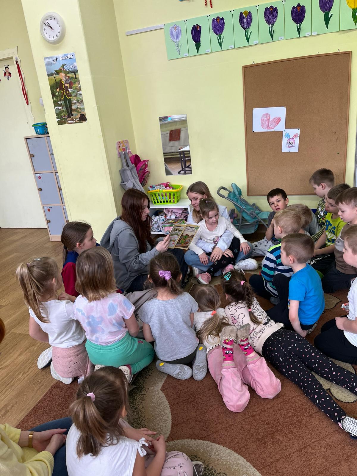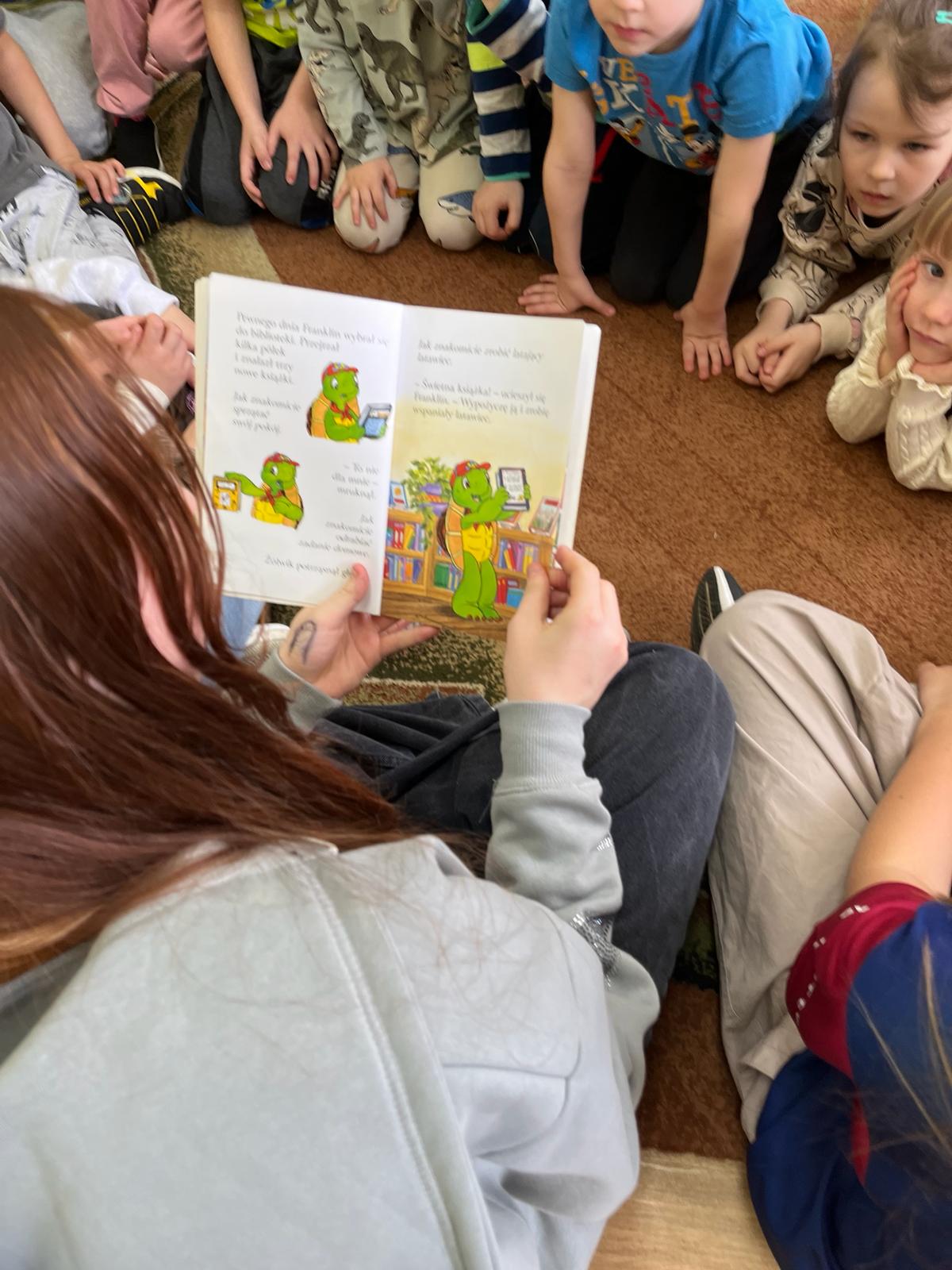 W poniedziałek -11 marca, uczennice i uczniowie klasy 6b: Lena, Ola, Paulina i Karol wybrali się znów na czytelnicze spotkanie. Tym razem odwiedzili grupę „Biedronek”. Przybliżyli przedszkolakom postać żółwika Franklina i zapoznali z treścią książki pt: „Franklin i książka z  biblioteki”. Przedszkolaki z uwagą słuchały czytanej bajki.