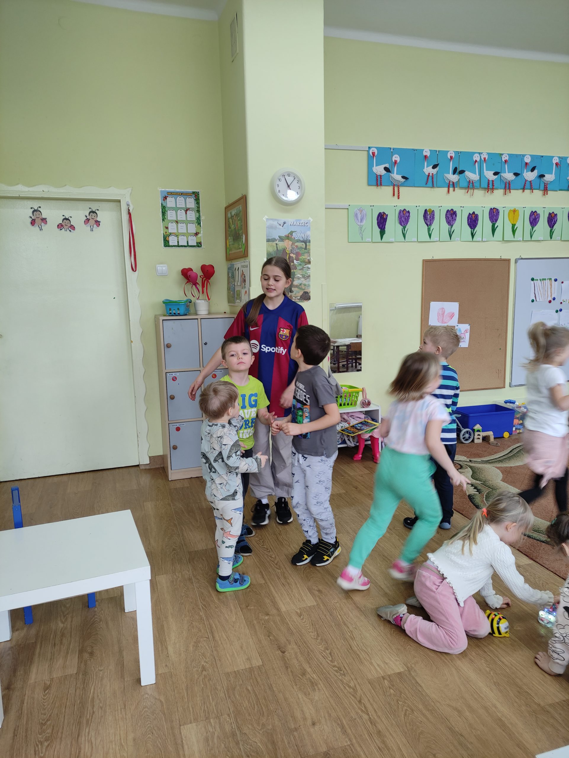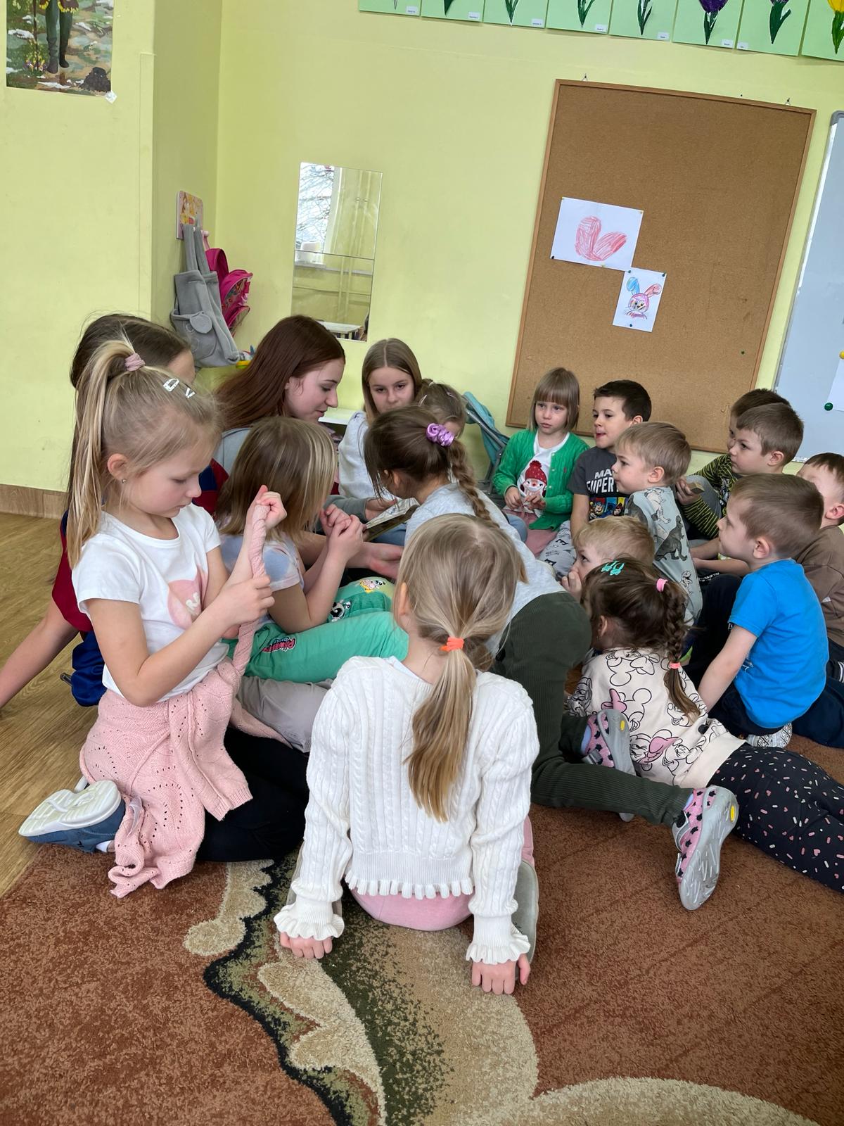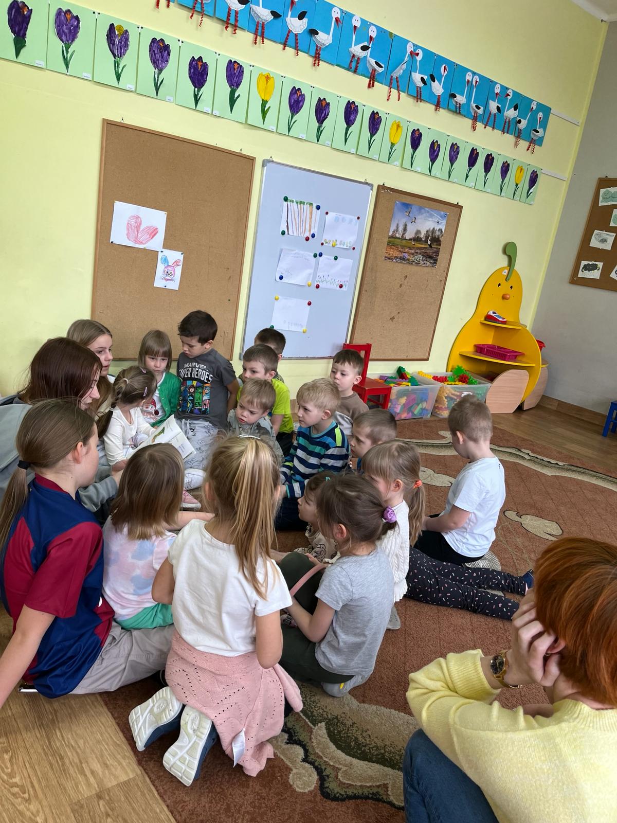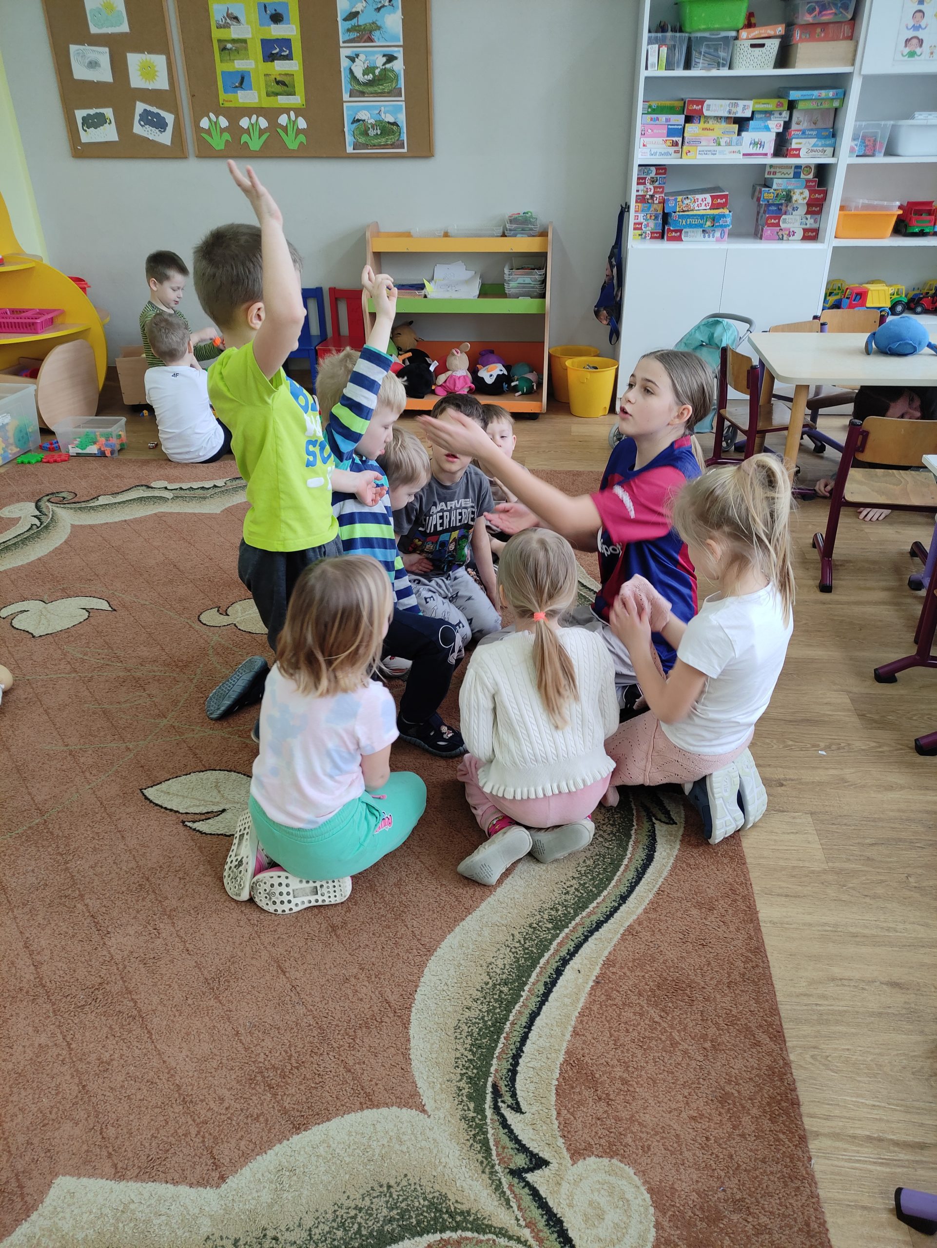 Później uczniowie wspólnie spędzili czas z przedszkolakami bawiąc się, robiąc masażyki na plecach przedszkolaków, grając w chowanego, układając klocki, czytając gazetki przyrodnicze oraz angażując dzieci w zabawy w kole.