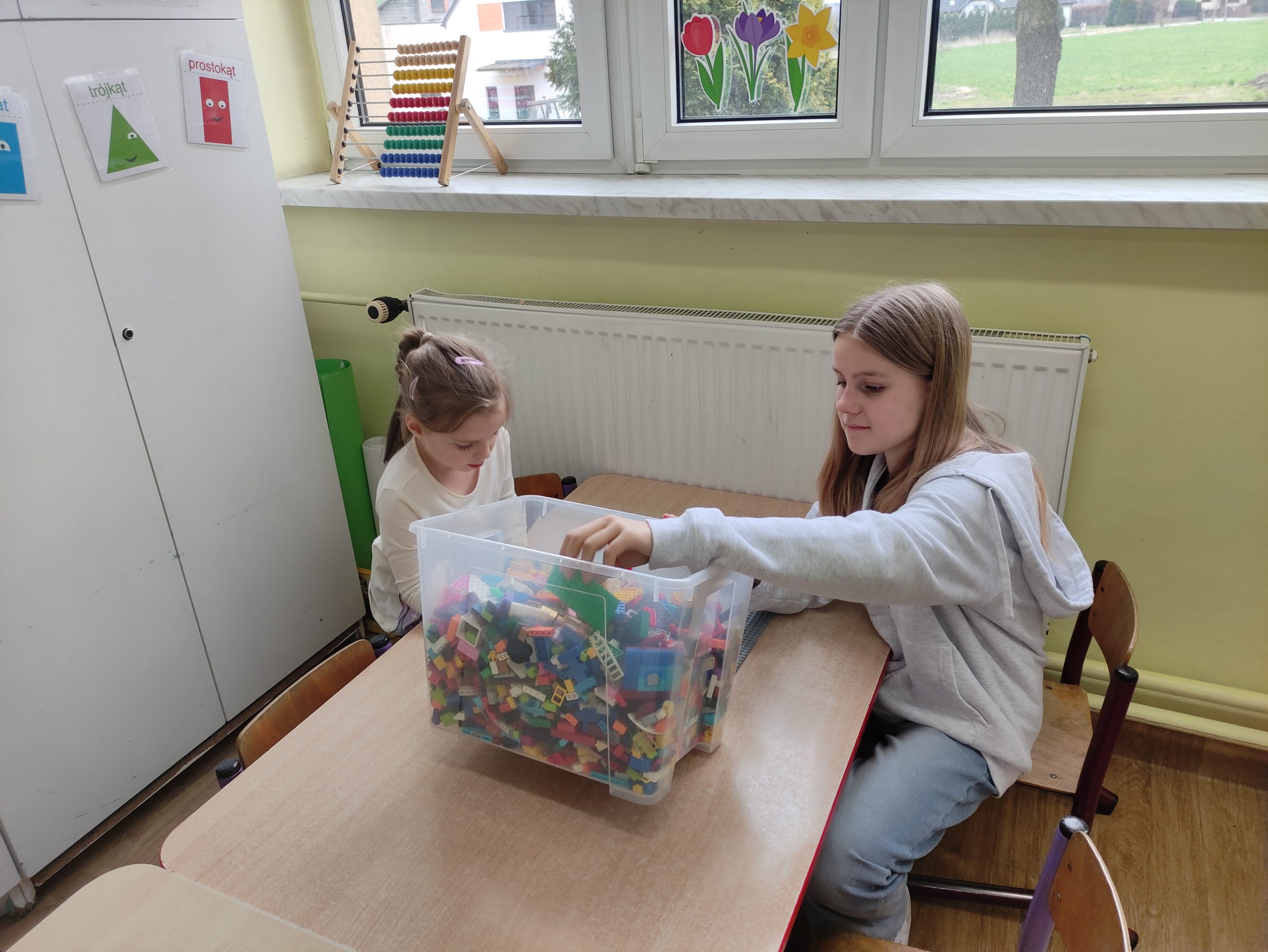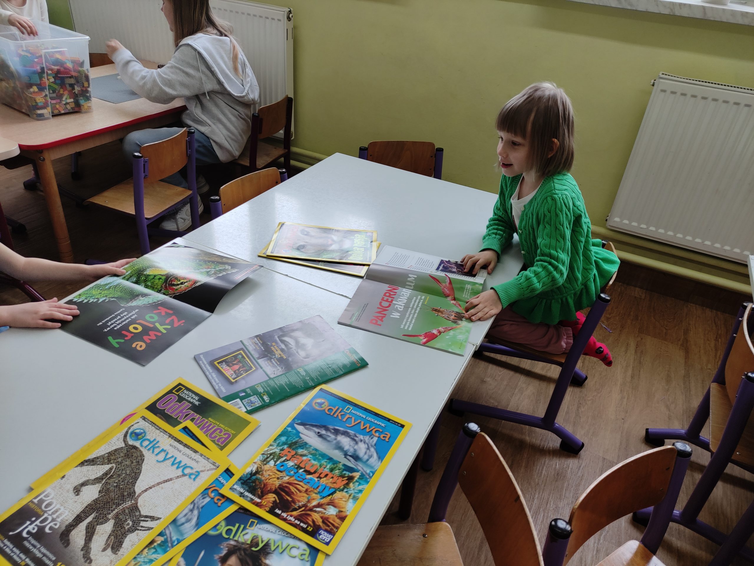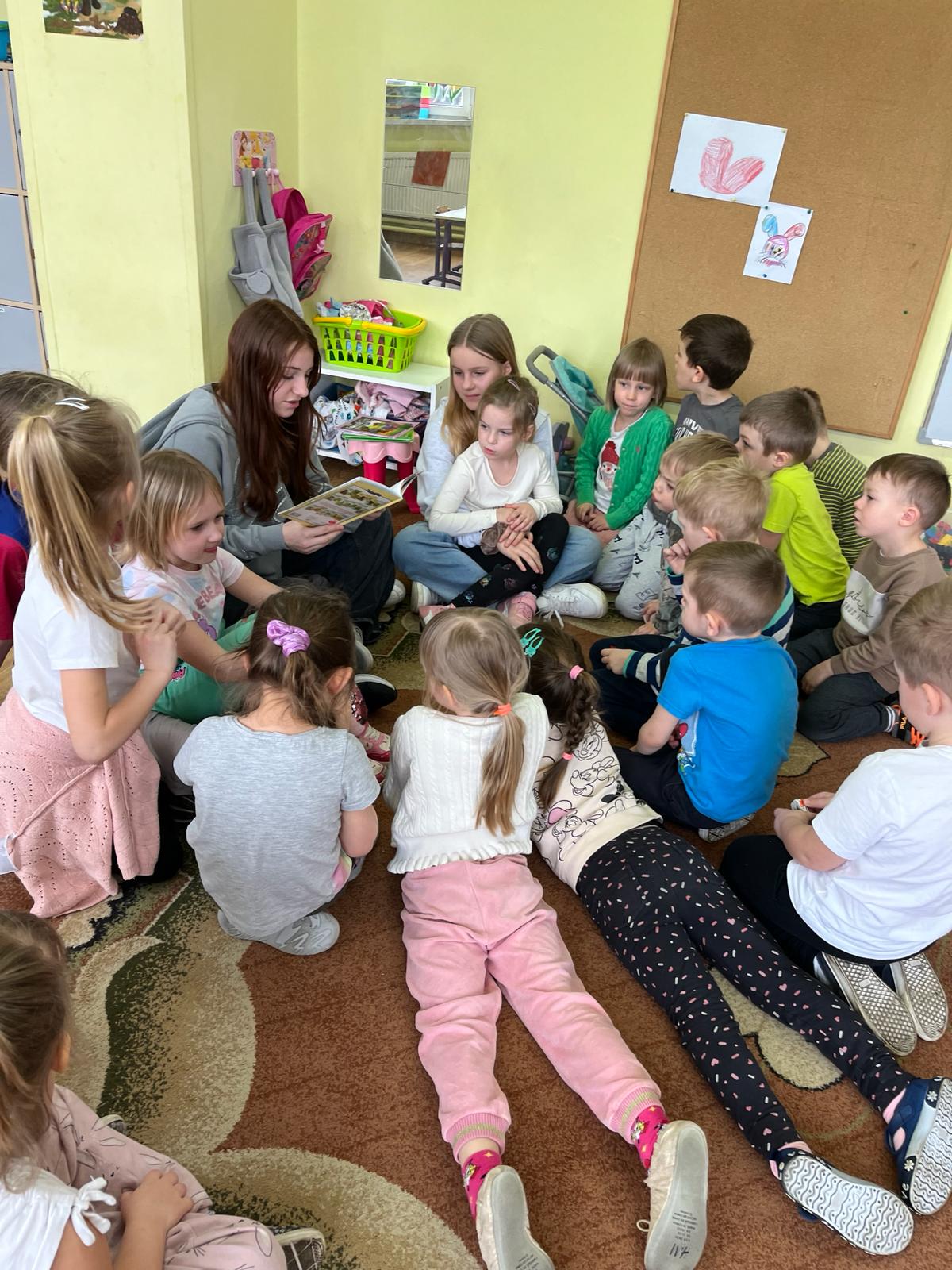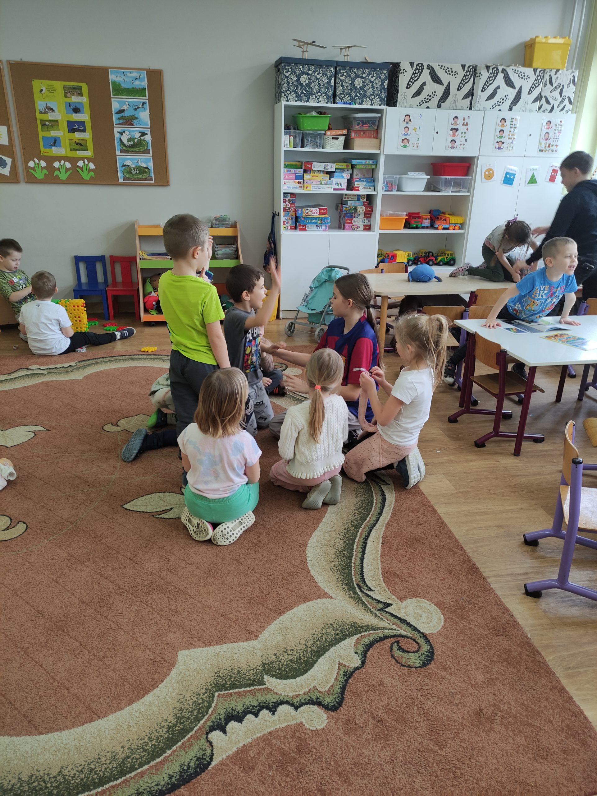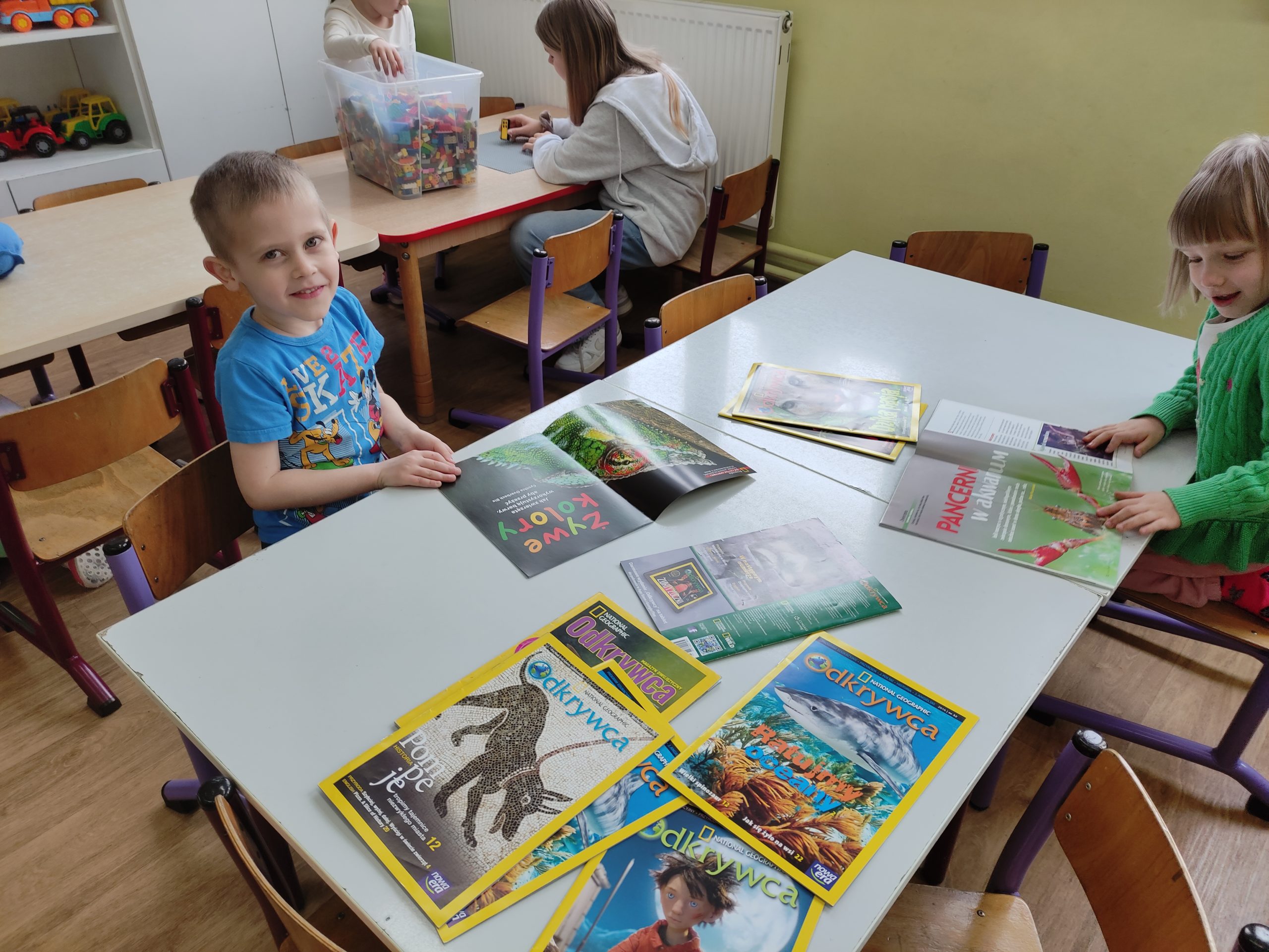 Później uczniowie wspólnie spędzili czas z przedszkolakami bawiąc się, robiąc masażyki na plecach przedszkolaków, grając w chowanego, układając klocki, czytając gazetki przyrodnicze oraz angażując dzieci w zabawy w kole.