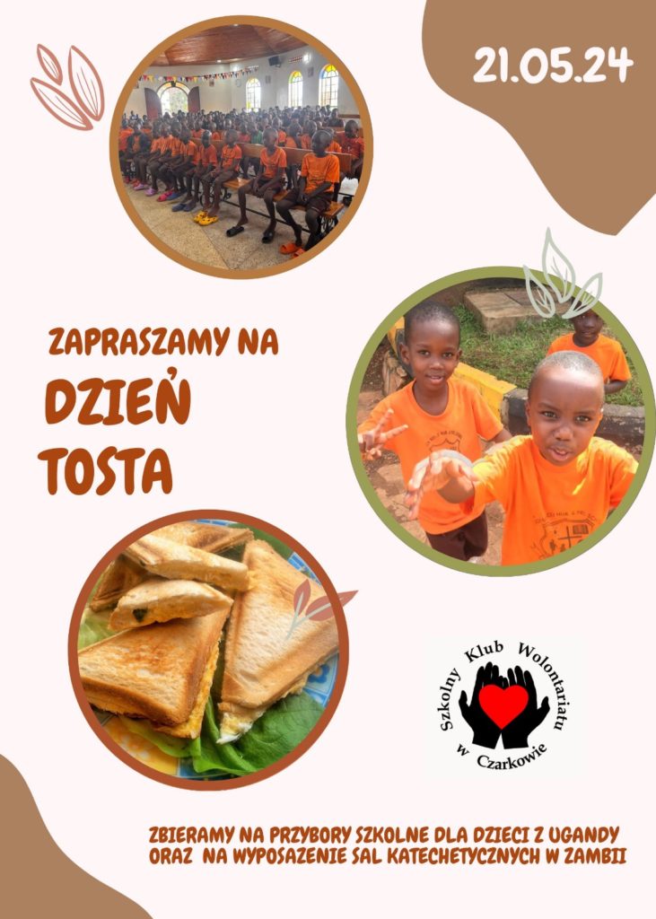 Szkolny Klub Wolontariatu zaprasza uczniów na Dzień Tosta, który odbędzie się 21 maja br. (wtorek) w naszej szkole. Zebrane środki chcemy przeznaczyć na przybory szkolne dla dzieci z Ugandy i wyposażenie salek katechetycznych dla księdza Michała Matysika, który jest na misji w Zambii.
