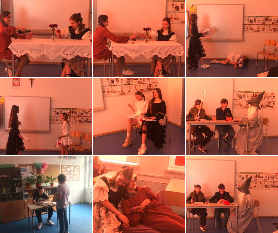 Uczniowie klasy 7 zamiast tradycyjnego sprawdzianu z lektury podjęli się wyjątkowego zadania – przygotowania krótkich scenek teatralnych inspirowanych wybranymi tekstami literackimi. W ich interpretacjach ożyli bohaterowie Zemsty, Hobbita, Opowieści wigilijnej, Harrego Pottera, Małego Księcia, Balladyny i Ani z Zielonego Wzgórza.