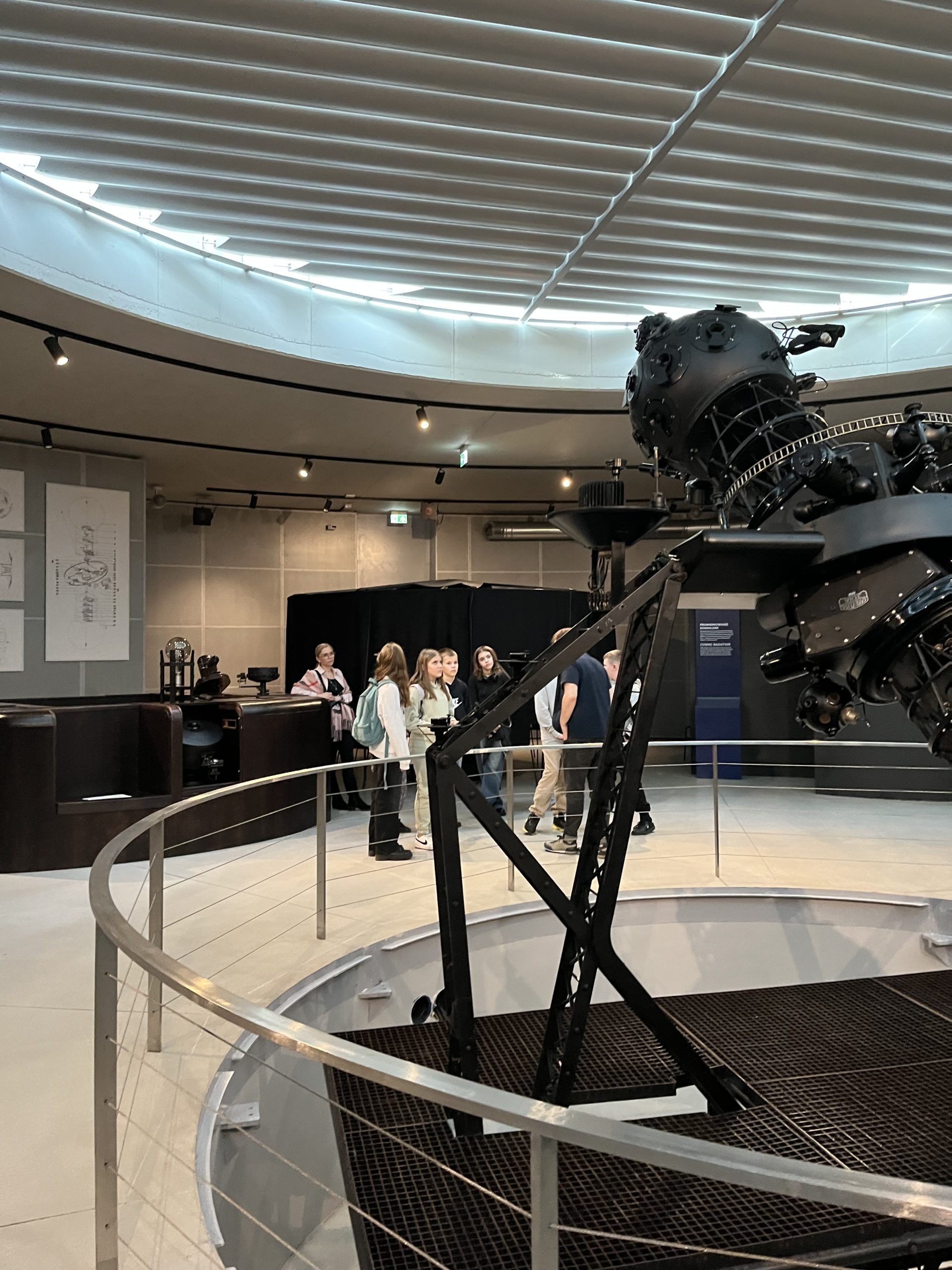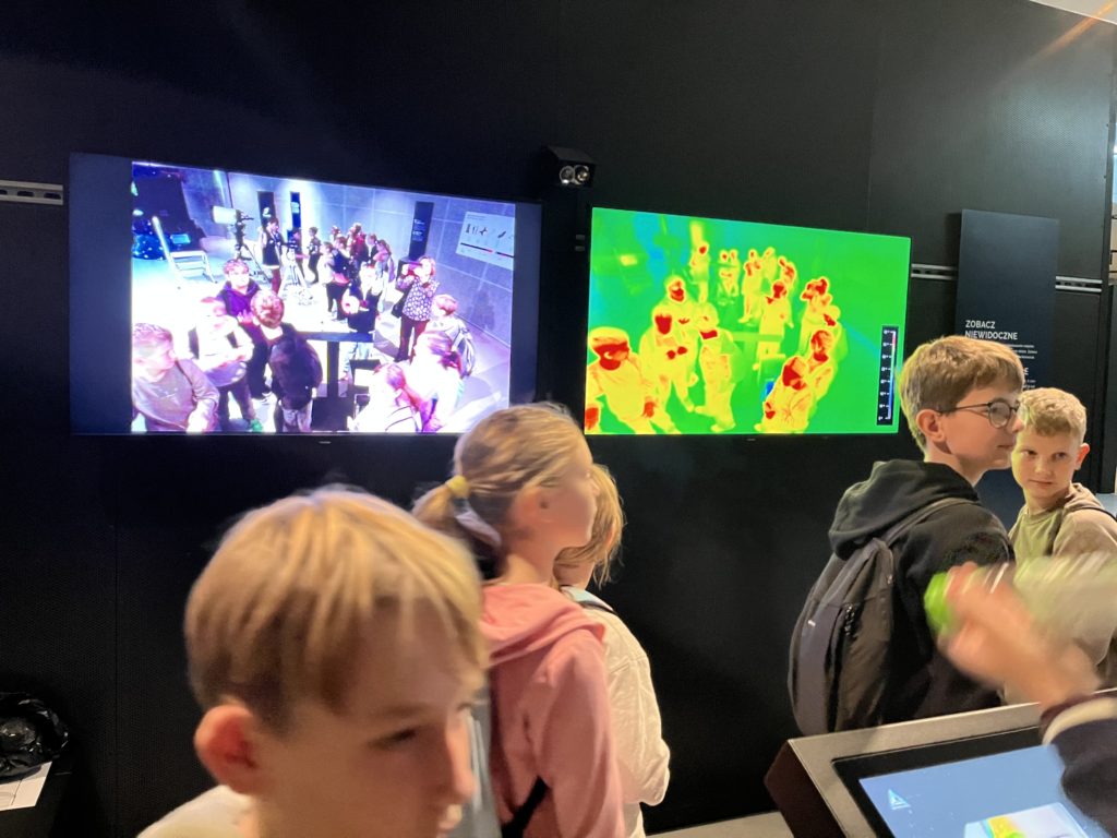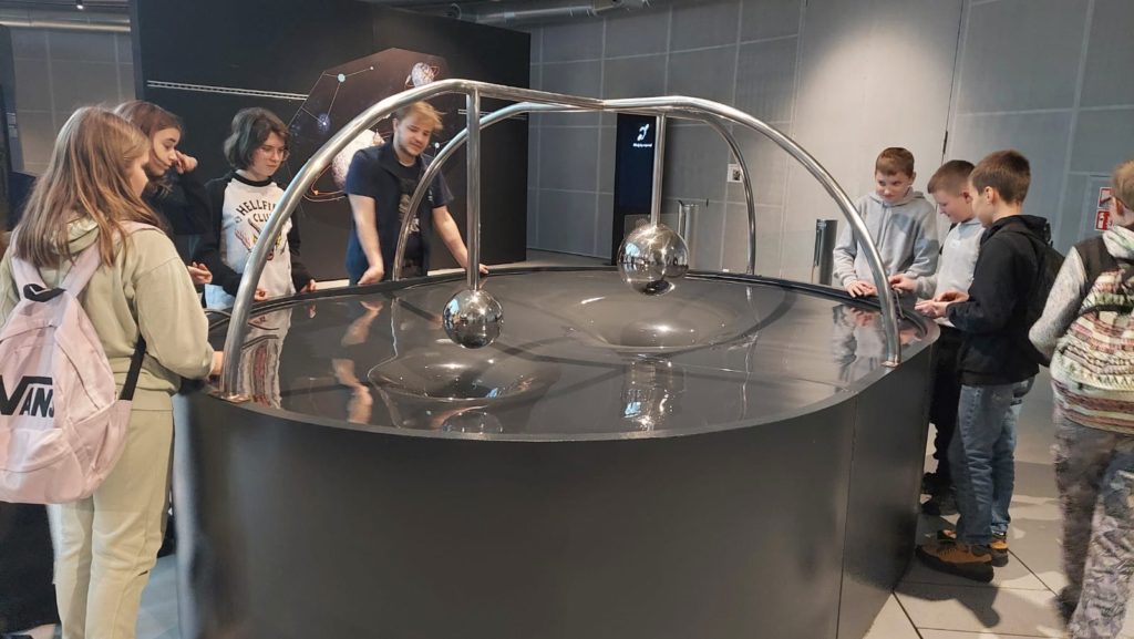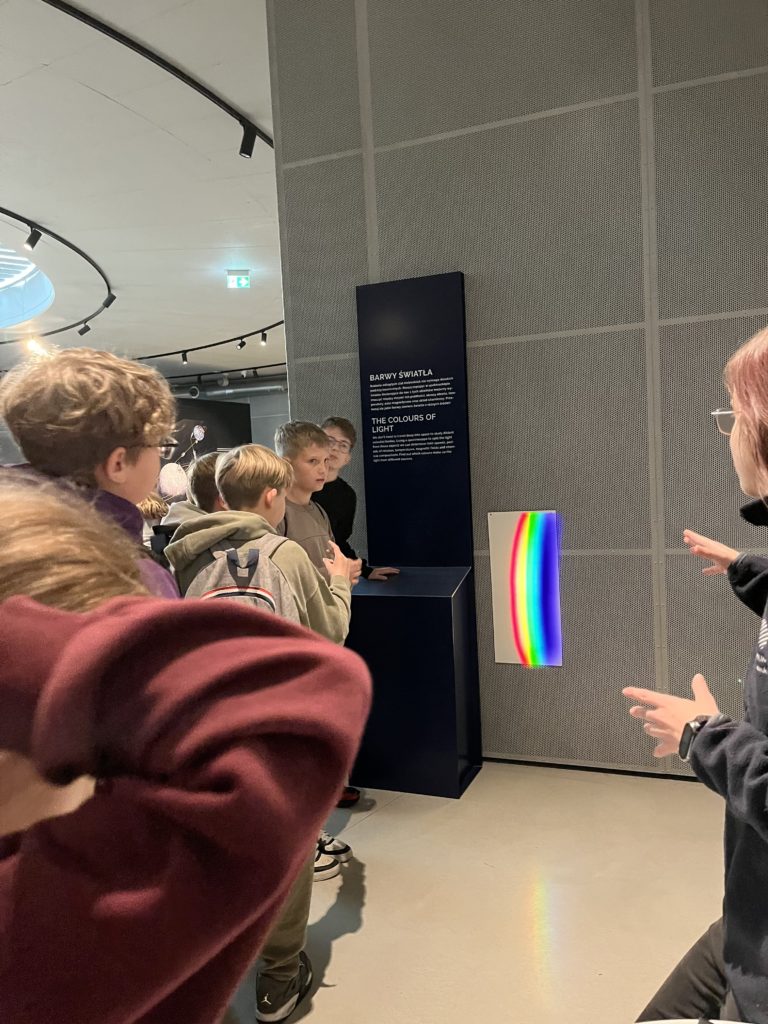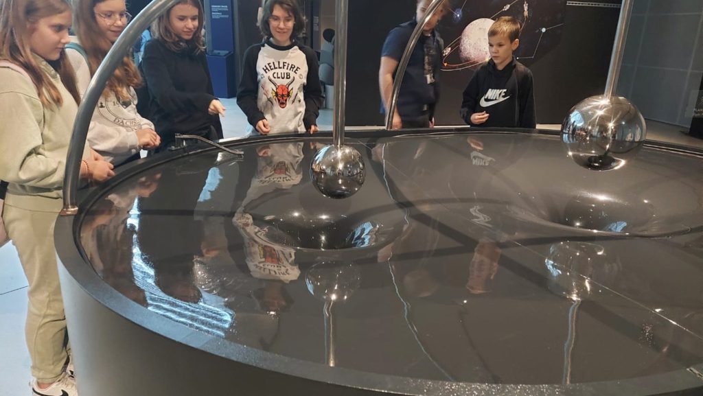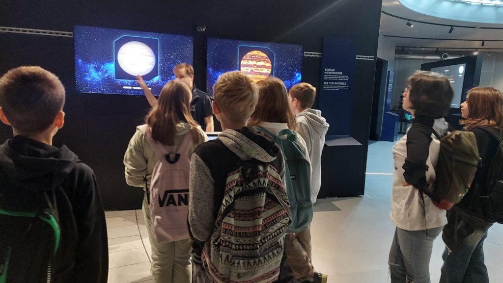 Pierwszym punktem, który wzbudzał niemałe emocje, było zwiedzanie ekspozycji Astronomia. W jej centralnym punkcie znajduje się słynny projektor Zeissa, który wyświetlał w Planetarium Śląskim gwiazdy przez prawie 63 lata. Zwiedzający mogli również zobaczyć drewniany pulpit sterujący. Wokół sali rozmieszczone były interaktywne stanowiska prezentujące zagadnienia związane z astronomią: między innymi różnego rodzaju instrumenty obserwacyjne takie jak lunety, czy teleskopy. Uczniowie poszerzyli wiedzę o życiu gwiazd, nauczyli się oceniać ich wiek na podstawie emitowanego światła. Ciekawym doświadczeniem było oglądanie siebie i swoich kolegów w podczerwieni, co zostało uwiecznione na zdjęciach. Jedną z największych atrakcji tej ekspozycji było pomieszczenia pozwalające na spacer wśród gwiazd w okularach 3D. Dzięki temu mogliśmy niemal dosłownie doświadczyć przemieszczania się we Wszechświecie.