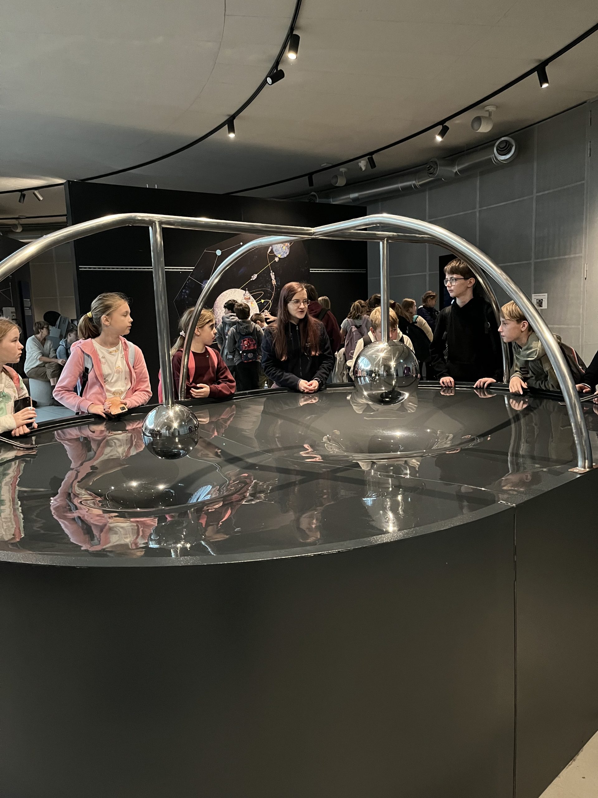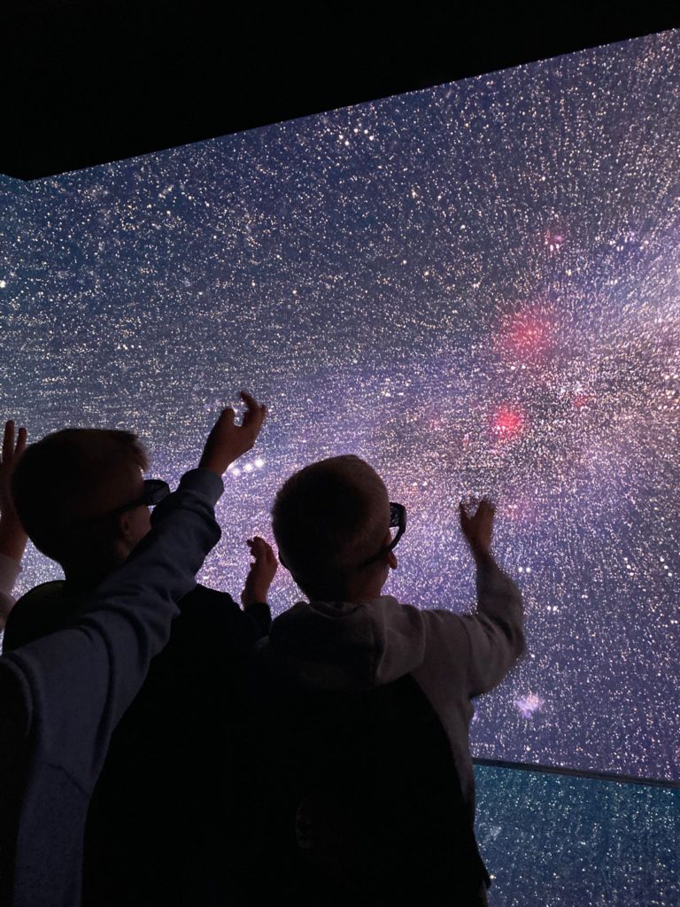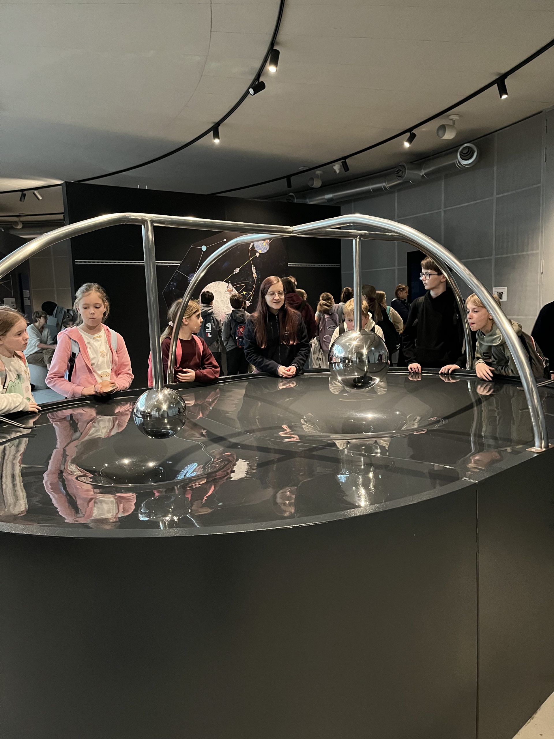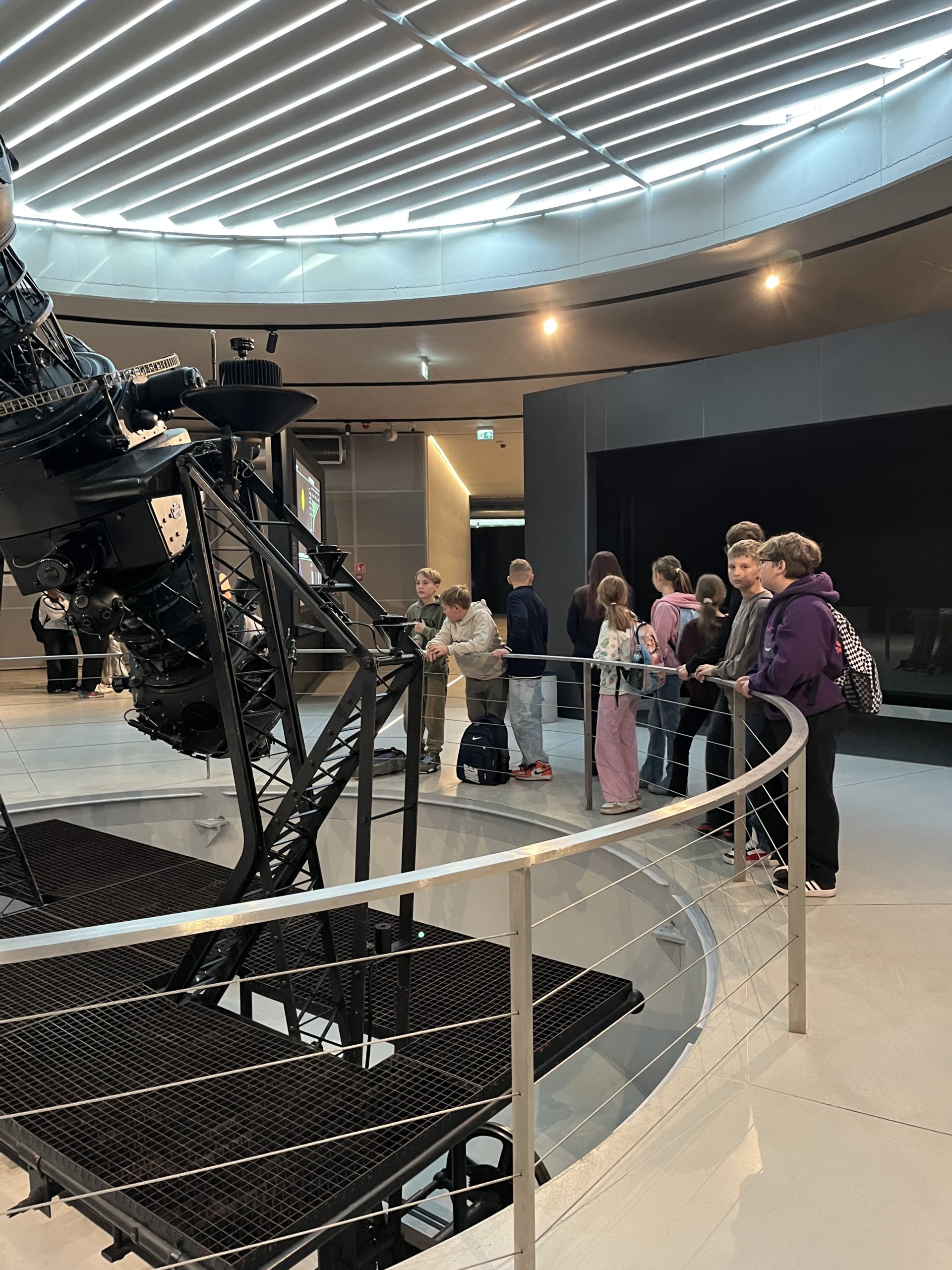 Pierwszym punktem, który wzbudzał niemałe emocje, było zwiedzanie ekspozycji Astronomia. W jej centralnym punkcie znajduje się słynny projektor Zeissa, który wyświetlał w Planetarium Śląskim gwiazdy przez prawie 63 lata. Zwiedzający mogli również zobaczyć drewniany pulpit sterujący. Wokół sali rozmieszczone były interaktywne stanowiska prezentujące zagadnienia związane z astronomią: między innymi różnego rodzaju instrumenty obserwacyjne takie jak lunety, czy teleskopy. Uczniowie poszerzyli wiedzę o życiu gwiazd, nauczyli się oceniać ich wiek na podstawie emitowanego światła. Ciekawym doświadczeniem było oglądanie siebie i swoich kolegów w podczerwieni, co zostało uwiecznione na zdjęciach. Jedną z największych atrakcji tej ekspozycji było pomieszczenia pozwalające na spacer wśród gwiazd w okularach 3D. Dzięki temu mogliśmy niemal dosłownie doświadczyć przemieszczania się we Wszechświecie.