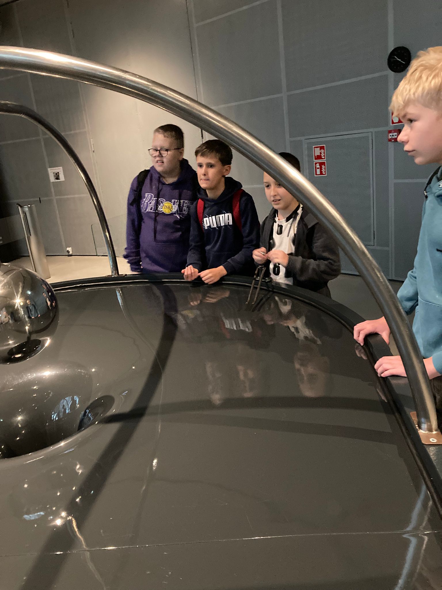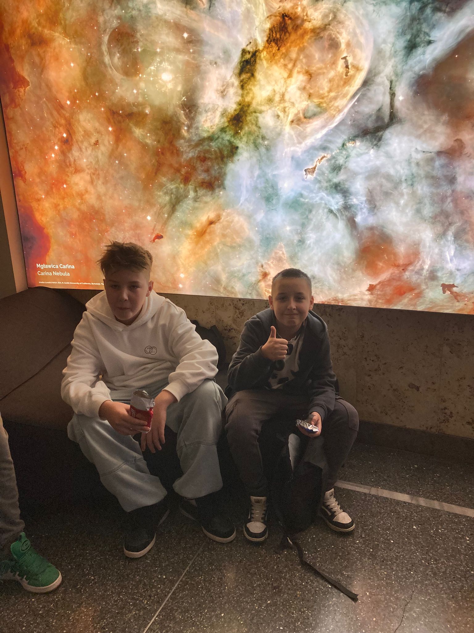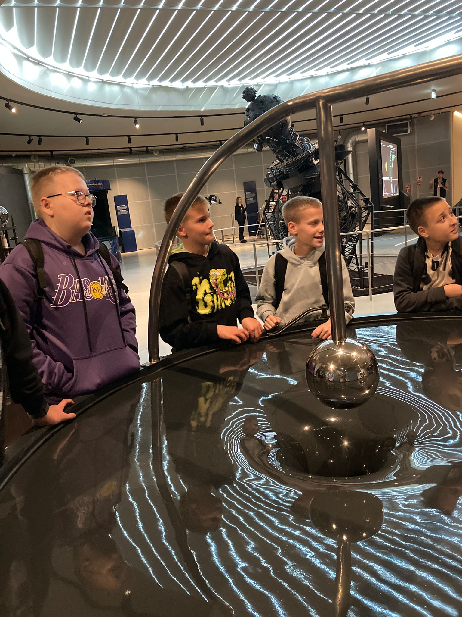 Pierwszym punktem, który wzbudzał niemałe emocje, było zwiedzanie ekspozycji Astronomia. W jej centralnym punkcie znajduje się słynny projektor Zeissa, który wyświetlał w Planetarium Śląskim gwiazdy przez prawie 63 lata. Zwiedzający mogli również zobaczyć drewniany pulpit sterujący. Wokół sali rozmieszczone były interaktywne stanowiska prezentujące zagadnienia związane z astronomią: między innymi różnego rodzaju instrumenty obserwacyjne takie jak lunety, czy teleskopy. Uczniowie poszerzyli wiedzę o życiu gwiazd, nauczyli się oceniać ich wiek na podstawie emitowanego światła. Ciekawym doświadczeniem było oglądanie siebie i swoich kolegów w podczerwieni, co zostało uwiecznione na zdjęciach. Jedną z największych atrakcji tej ekspozycji było pomieszczenia pozwalające na spacer wśród gwiazd w okularach 3D. Dzięki temu mogliśmy niemal dosłownie doświadczyć przemieszczania się we Wszechświecie.