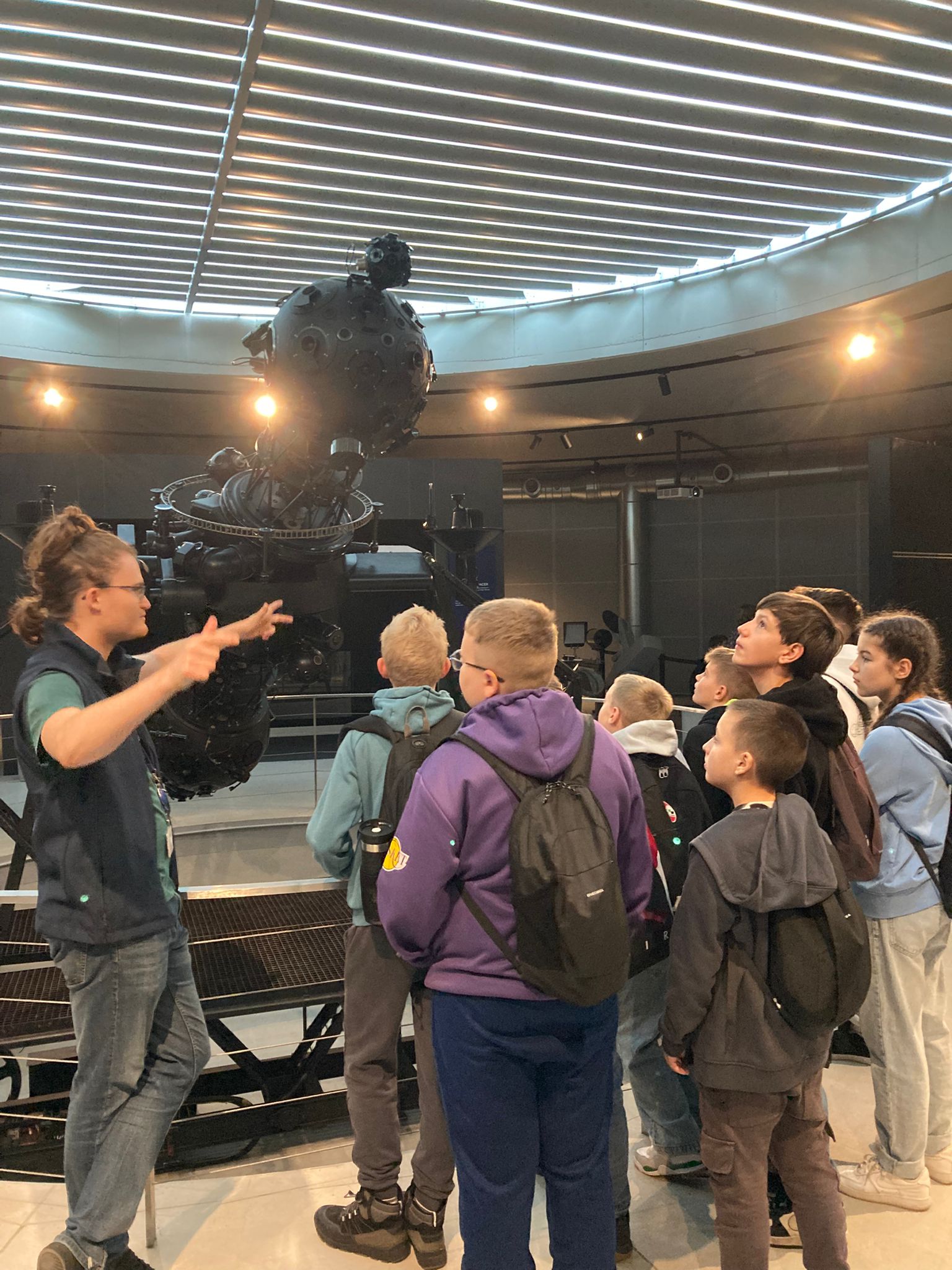 Następnie w dużej sali projekcyjnej odbyły się dwugodzinne zajęcia dydaktyczne „ Cztery pory roku”. Wielkie wrażenie na uczniach wywarła olbrzymia kopuła sali stanowiąca ekran sztucznego nieba. To na niej aparatura projekcyjna odtwarza wygląd nieba w dowolnym czasie i z dowolnego miejsca na Ziemi. Ruchome projektory Słońca, Księżyca i planet pokazują wszelkie zmiany na niebie. Uczniowie poznali model geocentryczny budowy świata, teorię heliocentryczną Mikołaja Kopernika, ruch obrotowy Ziemi (zmiana dnia i nocy), ruch obiegowy Ziemi (zmiany pór roku). Zobaczyli gwiazdy i gwiazdozbiory, wzbogacone o ciekawe mityczne legendy. Będą one inspiracją do świadomej obserwacji nieba, poszukiwania poznanych obiektów, jak choćby gwiazdozbioru Wielkiej Niedźwiedzicy, czy Oriona.