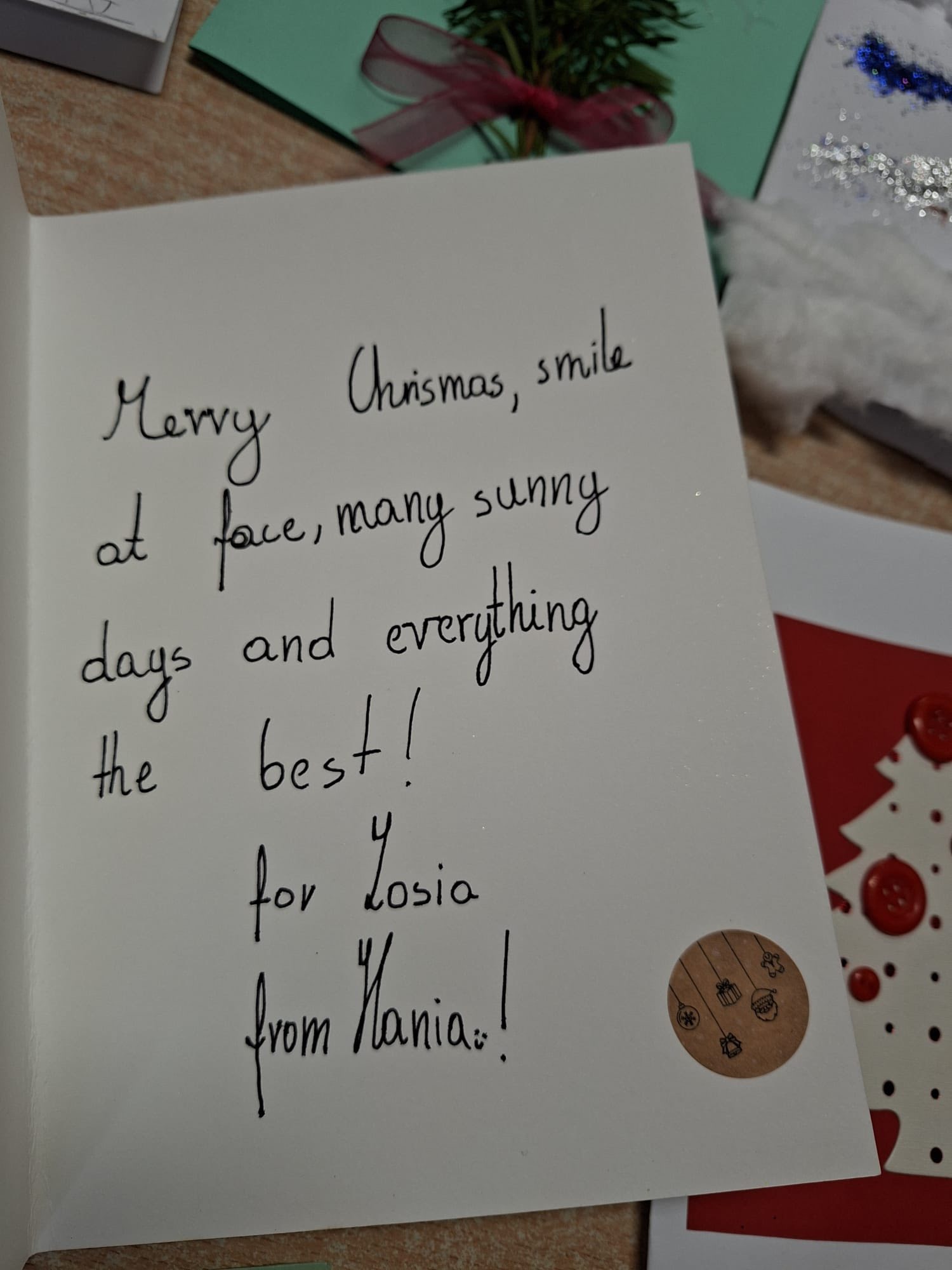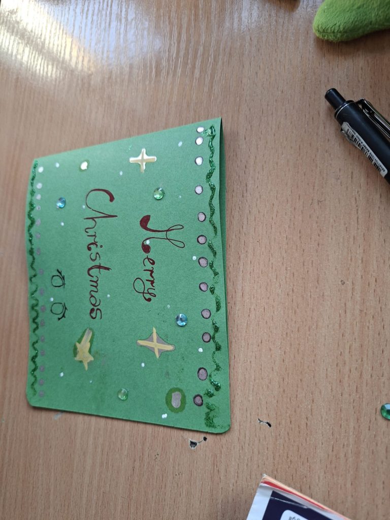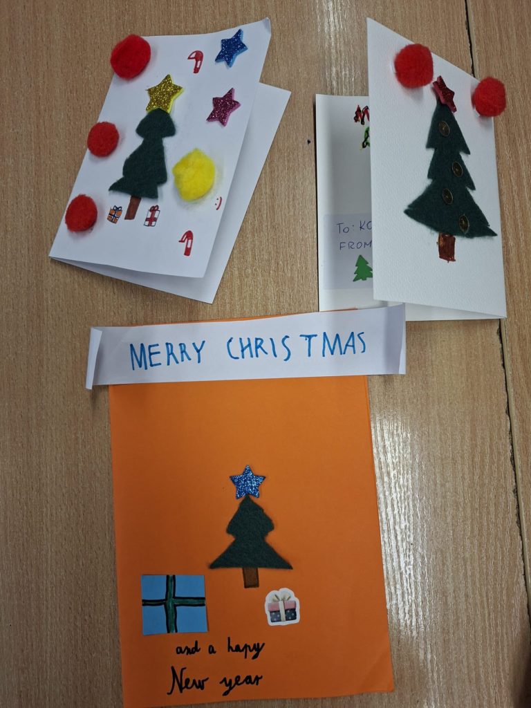 Uczniowie klasy 5 wykonali podczas zajęć kreatywne i urocze kartki świąteczne. Życzenia w języku angielskim adresowali do uczniów ze szkoły w Piasku. W czwartek otrzymali kartki wykonane przez obdarowanych czwartoklasistów, co wprawiło wszystkich w świąteczny nastrój.